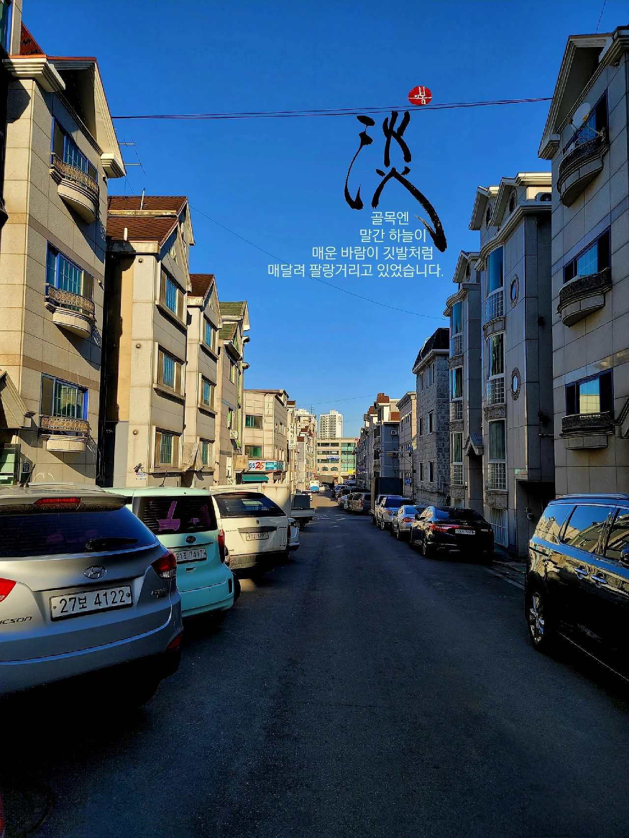 골목을 가로지르는 전선에 매달린 것들이 팔랑팔랑 흔들렸습니다. 깃발처럼 맑은 소리로 흔들렸습니다. 바라봄이 좋아서 싱겁게 웃었습니다. 옅은 미소가 지어졌고 말간 하늘이 내려다보고 있었습니다. 이런 순간이 淡交일까요? 저 혼자 좋아서 고백을 하게 됩니다.