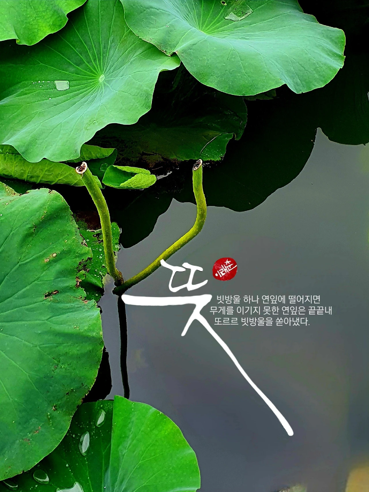 방금까지 햇살에 반짝이던 빗물은 더는 없다. 또르르 갸우뚱 기운 연잎을 구르는 순간 연못의 흙탕물이 되었다. 누구의 탓도 아니다. 아흔아홉 모였던 빗방울에 하나를 더하는 순간이면 연잎은 무게를 이기지 못했다. 그게 전부였다. 마지막 한 방울의 무게가 문제였다 타박하지 마라. 뜻하고 내리는 빗방울은 없다. 그저 소낙비가 내렸을 뿐이다.