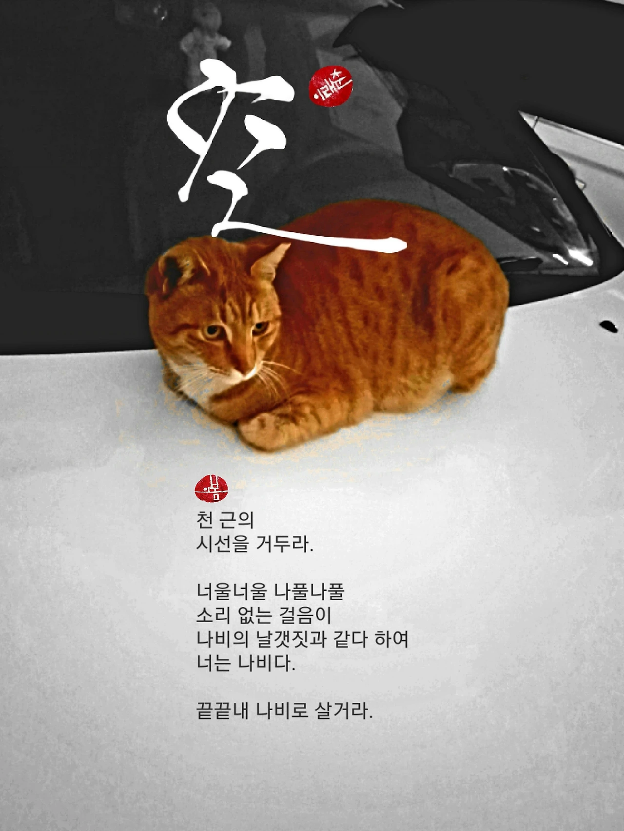 도망치려는 기색도 없었다. 잔뜩 웅크린 몸뚱이를 바짝 보닛에 붙이고는 미동도 않는다. 그럴싸한 먹거리가 아니라면 애써 차지한 따뜻한 자리를 양보하고 싶지 않다는 항의였다. 차는 방금 운행을 마치고 멈춘 모양이다. 고양이에게 다가갔을 때 훅 끼쳐오던 열기로 봐서 그랬다. 사료 몇 알이라도 손에 들린 게 아니었으므로 바로 꼬리를 내렸다. 그래, 따뜻한 곳에 앉아 몸이라도 데우거라. 너의 말처럼 나는 가던 길이나 가련다.