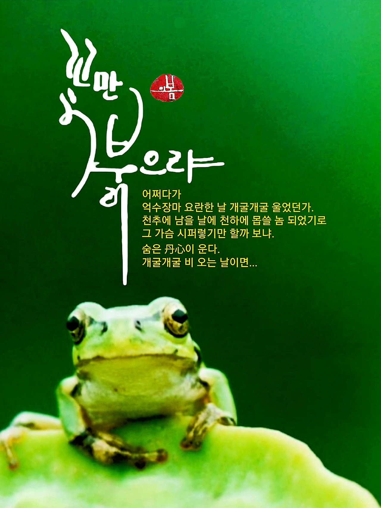 어쩌다가 하필이면 억수장마 요란한 날에 개굴개굴 목청을 높여 울었던가. 한스러웠다. 언 놈이 이런 몹쓸 소문을 옮겼는지 울화가 치밀었다. 빗소리를 믿고 천둥소리에 기대는 게 아니었다. 후회는 허허로왔을 뿐 아무런 힘도 되지 못했다. 그렇지만 천추에 남을 날에 천하에 몹쓸 놈 되었기로 그 가슴이 시퍼렇기만 할까 보냐. 어미 잃은 청개구리도 단장의 아픔에 울었을 뿐이다. 콩알만 한 가슴에도 숨은 丹心이 있기 마련이다. 이래저래 청개구리가 운다. 개굴개굴 비 오는 날이면...