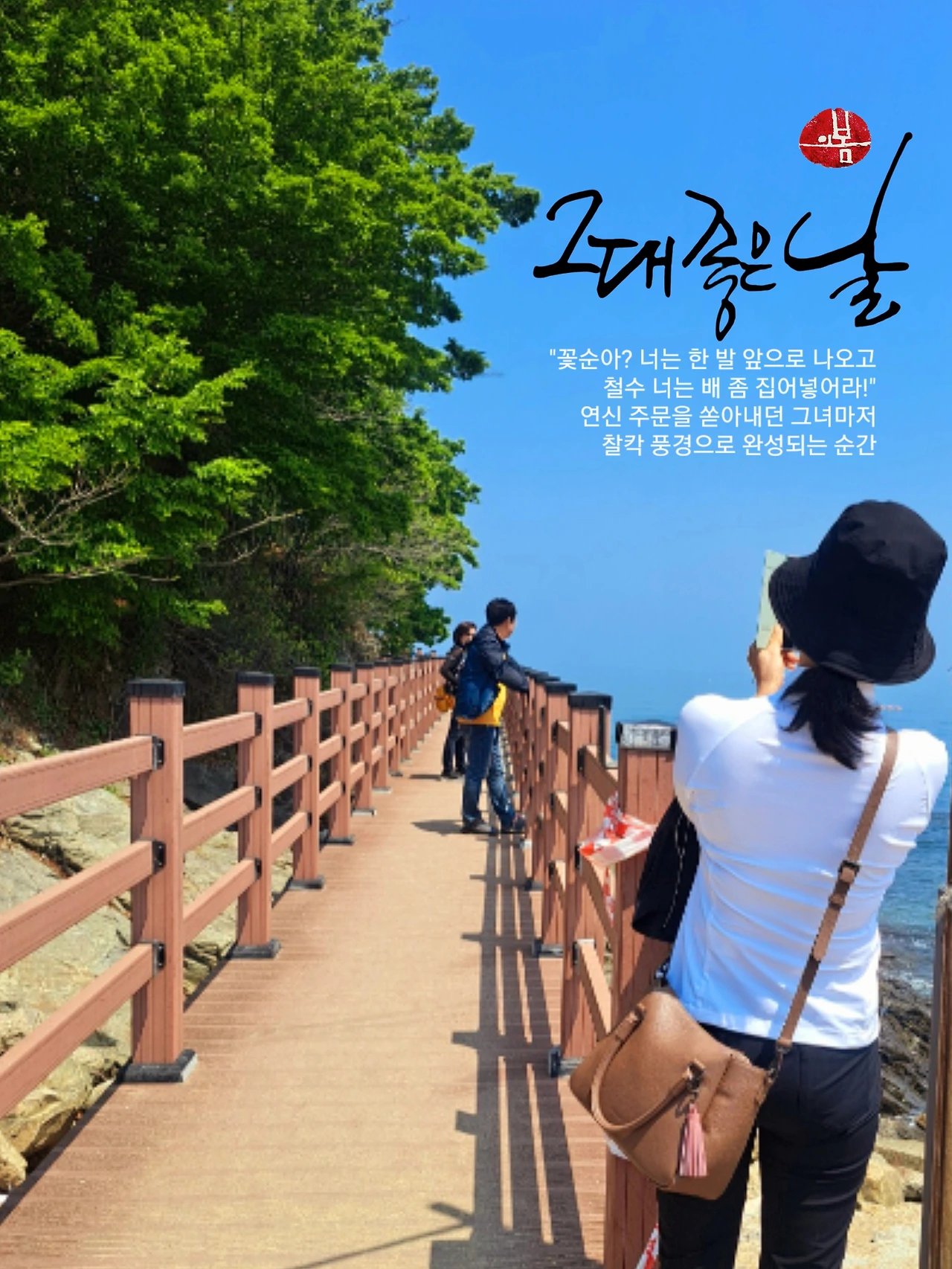 눈앞에 사진 한 장 띄워놓았다. 사진에 담긴 풍경은 바닷가 둘레길이다. 남 녀 각 한 명씩 피사체가 되어 난간 앞에 서서 바다를 바라보고 있고, 하얀 셔츠를 입은 여인이 핸드폰 카메라를 들이밀고 섰다. 길의 왼쪽에는 초록이 짙은 숲이 푸른 손을 뻗고 있었다. 푸른 바다와 파란 하늘 그리고 초록의 숲 사이로 뻗은 길은 그래서 아름다웠다. 맑은 햇살 한 줌에 풍경이 반짝였다. 보이지도 않는 바람이 시원스레 불어갈 터였다.