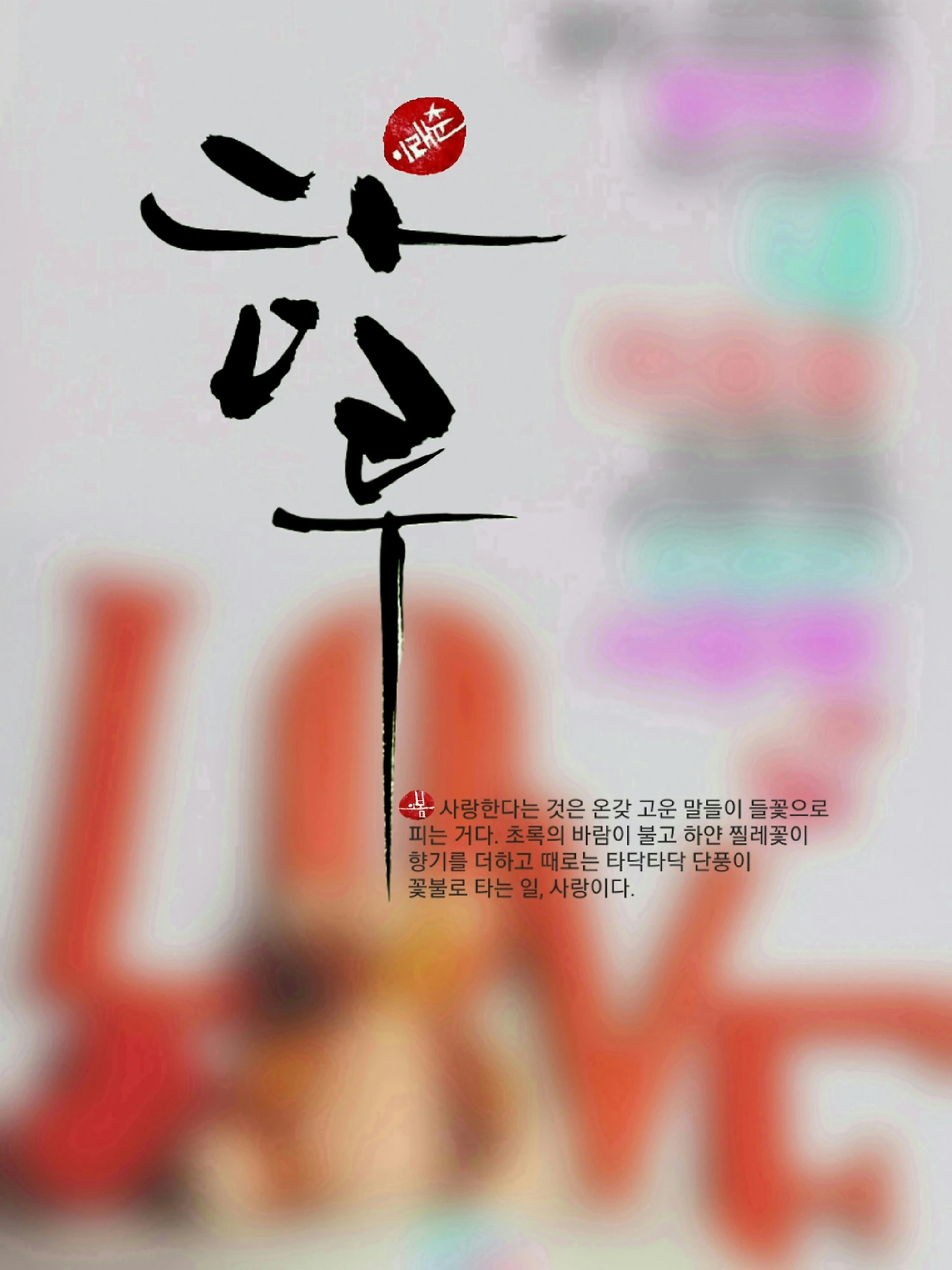 늘 진해형이어야만 한다. 그래서 사랑했다'가 아니고 사랑한다'이다. 나는 오늘도 너를 사랑한다. 그래서 늘 고운 말들이 들꽃으로 피는 거다. 초록의 바람이 불고, 하얀 찔레꽃이 향기를 더하고, 때로는 타닥타닥 단풍이 꽃불로 타는 일, 그게 사랑이다.