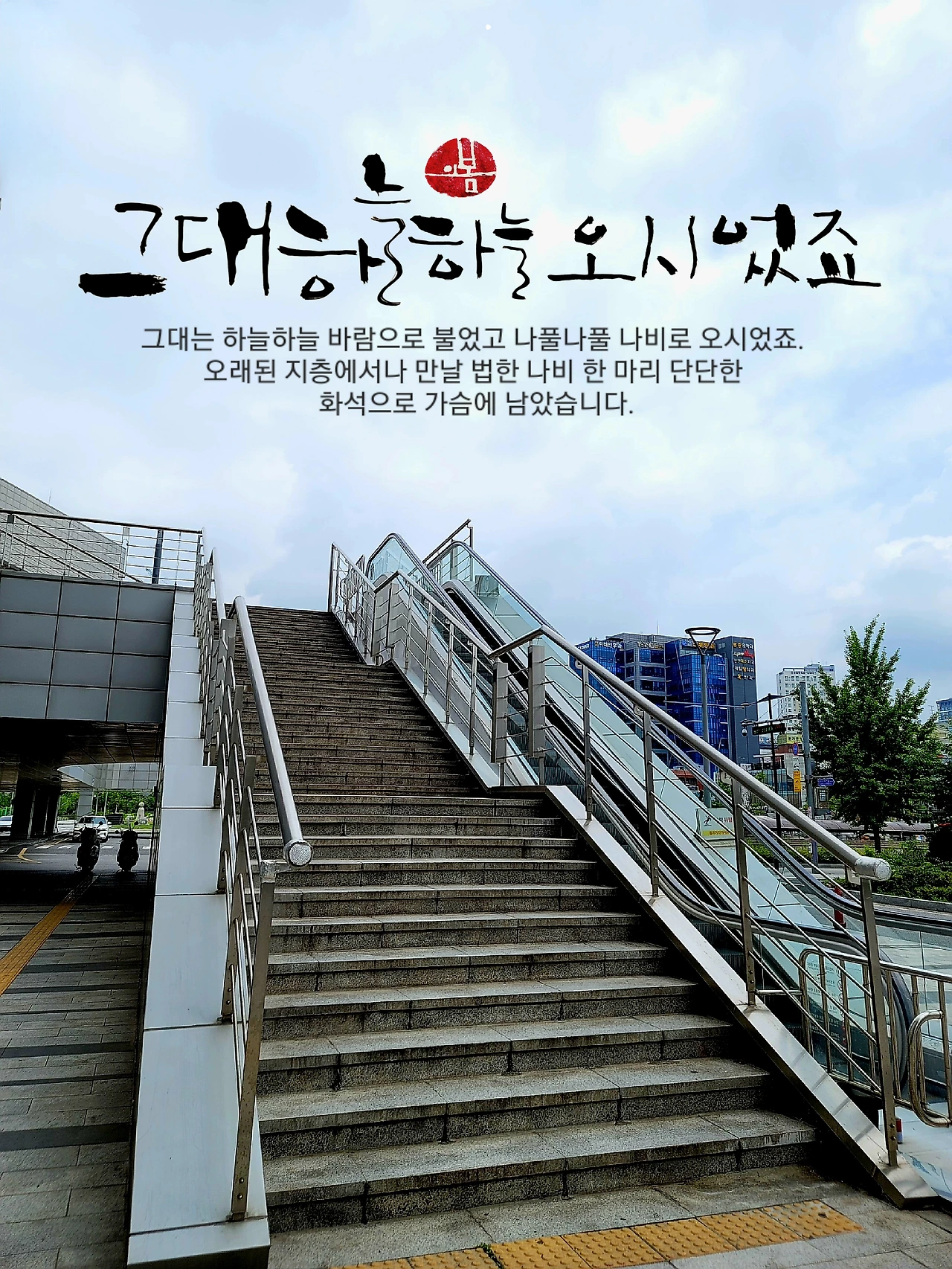 누군가는 당산역 계단에서 보았던 나비 한 마리를 의정부역 계단에서 만날지도 모릅니다. 그도 그럴 테지요. 덜컹덜컹 기차가 지나가고 우르르 사람들이 쏟아져 나오면, 망초꽃 흐드러진 풀밭에 하얀 바람으로 날고 있는 나비를 만나겠지요. 너울너울 가슴에 새겨지는 암각화가 황홀할 게 분명합니다. 물끄러미 역사의 계단 앞에 서서 웃고 있는 사람들이 꽃처럼 필 터입니다. 기억이란 때로 꽃보다 향기롭기도 하니까요.