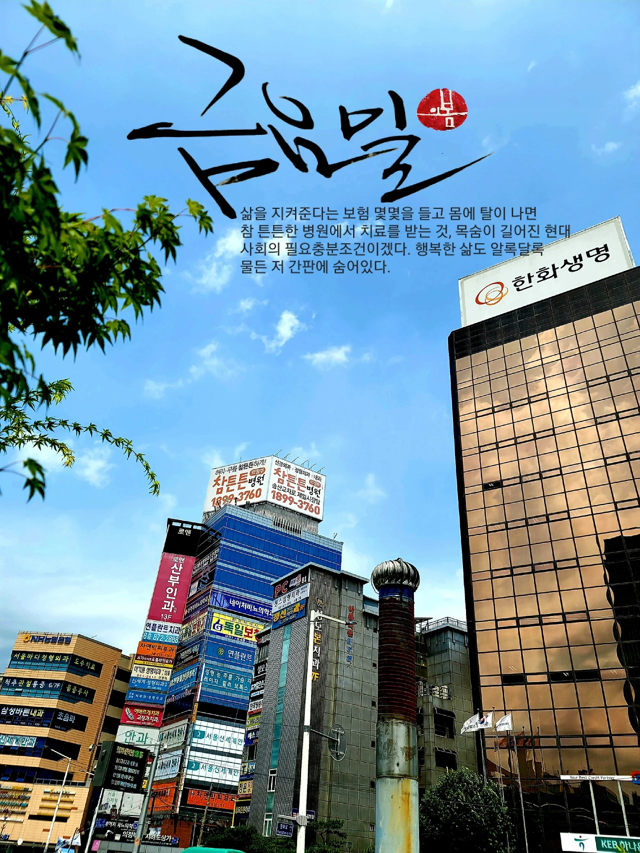 그늘에 앉아 바라본 거리가 알록달록 화려하기도 하다. 잘 먹고 잘 사는 걸 도와준다고 목청을 높인다. 보통은 삶을 지켜준다는 보험 몇몇을 들고 몸에 탈이 나면 참 튼튼한 병원에서 치료를 받는다. 목숨이 길어진 현대사회의 필요충분조건이겠다. 행복한 삶도 알록달록 물든 간판에 숨어있었다. 보물 찾기에 늘 잼병이 인 내가 문제다. 저렇게 숨겨진 보물이 넘쳐나는데....