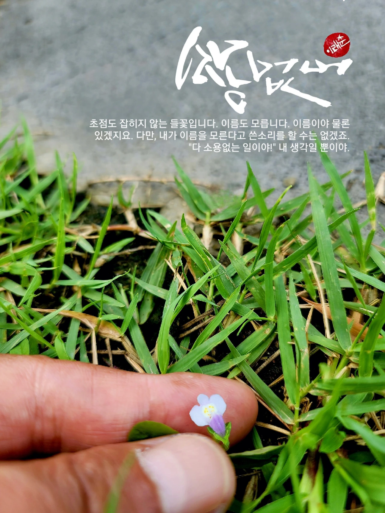 이름 없는 아니, 모르는 들꽃이라고 하찮게 볼 일은 없는 거 같아. 워낙에 작아 눈에 담을 수 없는 녀석이라지만 결국 무릎을 꿇는 건 궁금함에 이끌린 나라는 거야. 녀석이야 평소처럼 잔디밭에 숨어 수줍은 미소를 머금고 있으면 그만이야. 어떻게 생겼을까? 궁금한 생각이 들면 산더미만 한 사람이 두 무릎을 꿇고 알현의 예를 올리게 되거든. 그러니 하찮다 구박하던 녀석에게 예를 올리는 나는 저 아래 까마득한 미물이 되는 거야. 그러니 뭐가 됐든 하찮고 소용없는 것들은 없어. 깔보고 구박하는 하찮은 내가 존재할 뿐이야.