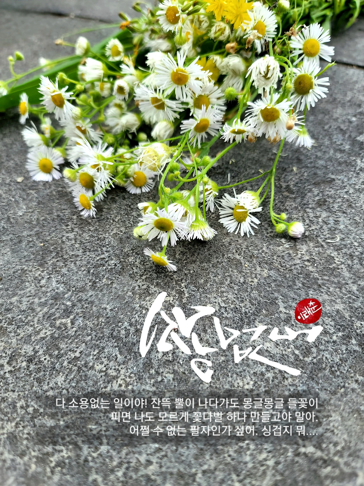 다 소용없는 일이야! 잔뜩 뿔이 나고 심드렁 심통이 나다가도, 몽글몽글 들꽃이 피면 나도 모르게 꽃다발 하나 만들고서 헤벌쭉 웃고야 말아. 복더위를 견디며 꽃송이 피워낸 들꽃에겐 미안한 마음이 들지만 어쩔 수 없는 일이야. 아마 들꽃도 그래, 까짓 거 잘라라 잘라! 얘기하려는 지도 모르겠어. 그저 팔자인가 싶어. 싱겁지 뭐....