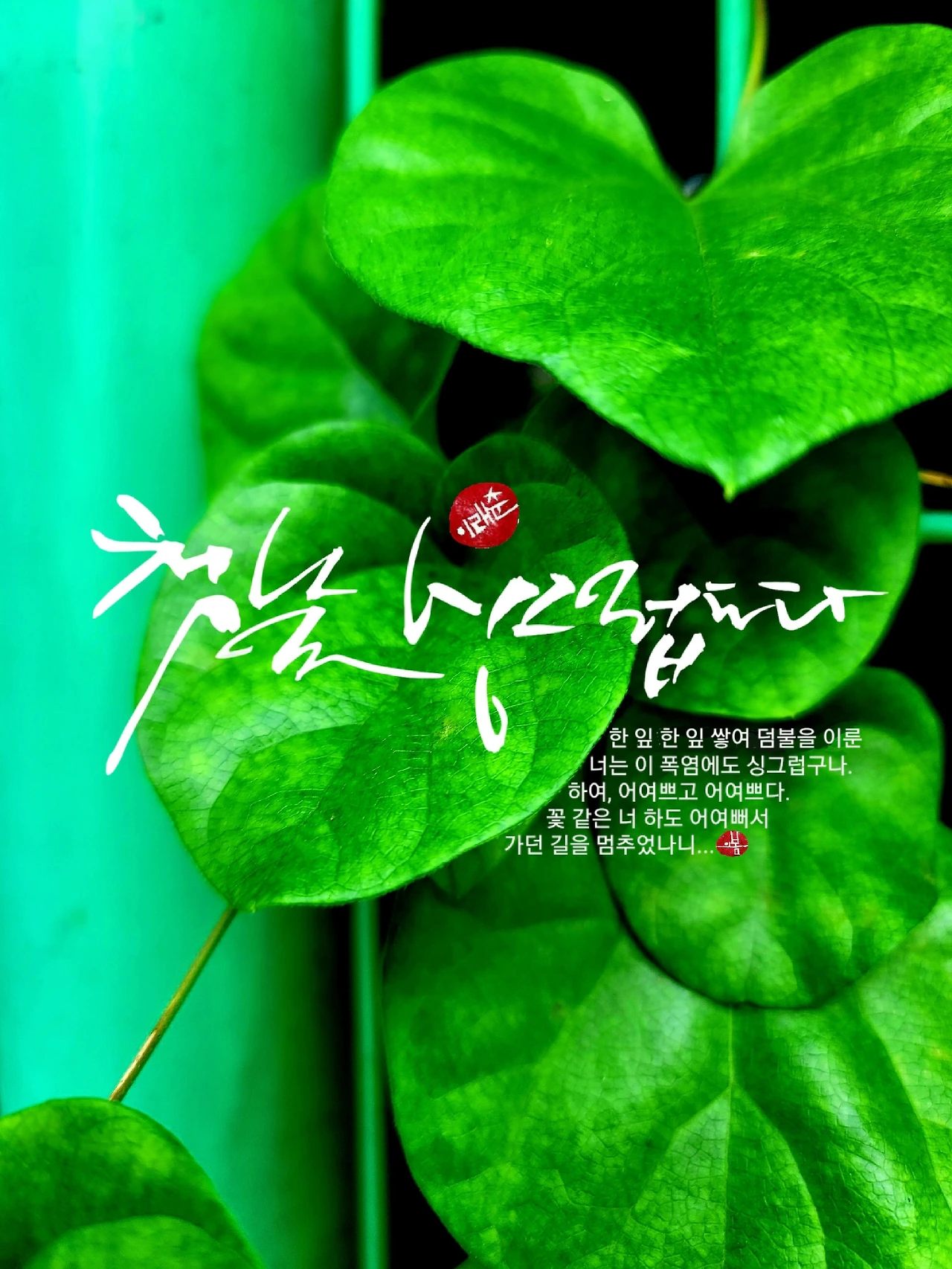 덩굴손 야무지게 틀어진 녀석이 철망을 기어올랐다. 한 잎 두 잎 손을 내밀고 앙칼지게 틀어쥐었다. 몇 날 며칠이 걸렸을까 생각조차 어려운 시간이었겠지만 물러서지 않은 시간은 제법 그럴듯한 덤불로 보상해 주었다. 종종걸음으로 지나치는 사람들을 등지고 사진을 찍었다. 싱그러웠다. 보는 순간이 눈이 시원했고 바람이라도 부는 것처럼 마음마저 시원했다. 한 잎 두 잎 기어오른 녀석의 선물이다. 고맙고 감사한 마음으로 사양하지 않았다.