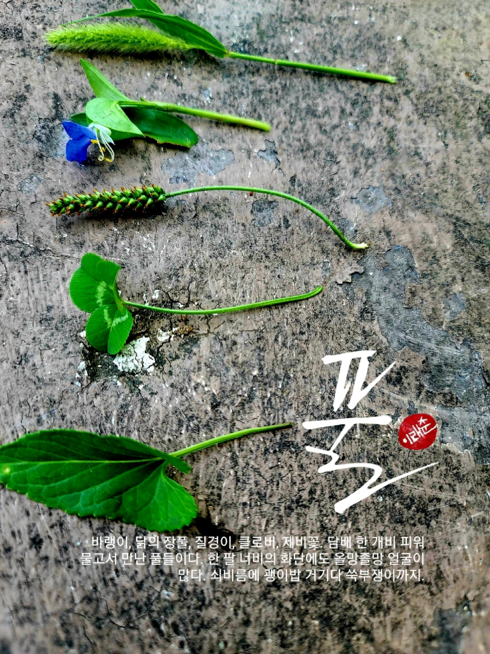아직은 따가운 햇살을 피해 느티나무 그늘에 엉덩이를 붙이고 앉았다. 그늘이 좋았고 바람이 좋았다. 몇 번의 재난경보문자가 날아들고는 있었지만 계절의 변화를 느낄 수 있었다. 어둡던 나무그림자가 조금씩 옅어지고 있었다. 부러진 발만 아니었다면 너무도 여유롭고 한가로운 마음이었다. 계절이 바뀌는 시간은 그만의 묘한 매력이 있었다. 물러나는 계절과 다가서는 계절이 뒤섞인 묘함이랄까. 시간은 그렇게 혼재돼 째깍대고 있었다. 그런저런 생각을 하고 있었다. 몇 번이고 잘려나간 화단의 풀들은 납작 엎드려 땅바닥을 기고 있었다. 바랭이, 닭의 장풀, 질경이, 클로버, 제비꽃.... 담배 한 개비 피워 물고서 만난 풀들이다. 한 팔을 뻗어 닿는 화단에도 올망졸망 얼굴이 많다. 쇠비름에 괭이밥 거기다 쑥부쟁이까지 온갖 들풀들이 이마를 맞대고 앉아 수다스러웠다. 그래서 초록이 가득한 화단을 들여다보아도 제각각 짙고, 옅고, 깊고, 얕고 잔치상을 한 자리씩 꿰차고 앉은 맛깔난 음식 같았다. 단조롭지 않았다. 싱겁지도 않았다. 짭조름한 그 맛이 좋아서 한참을 들여다보았다.