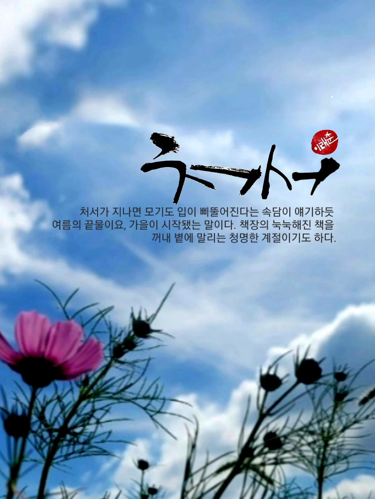 모기 입이 정말 삐뚤어졌는지 확인하지는 못했습니다. 날씨가 끄물끄물한 오늘이라서 조석으로 부는 바람이 선선해졌는지도 확인할 수가 없었습니다. 그렇지만 단지 처서라는 절기의 이름만으로도 충분히 그랬으리라 하는 기대감이 들더군요. 그동안 겪어본 바로도 확연히 달라지는 계절이 있음을 짐작할 수 있지요. 비지땀을 흘리면서 언제 가을이 올까 학수고대했습니다. 하도 맹렬한 더위라서 가을이 오기는 하는 걸까 반신반의하기도 했지요. 주마등처럼 스쳐가는 기억입니다. 오기는 하였네요. 오락가락 비마저 내리는 날이라서 벌써 가을이구나! 설레발을 떨 지경입니다.