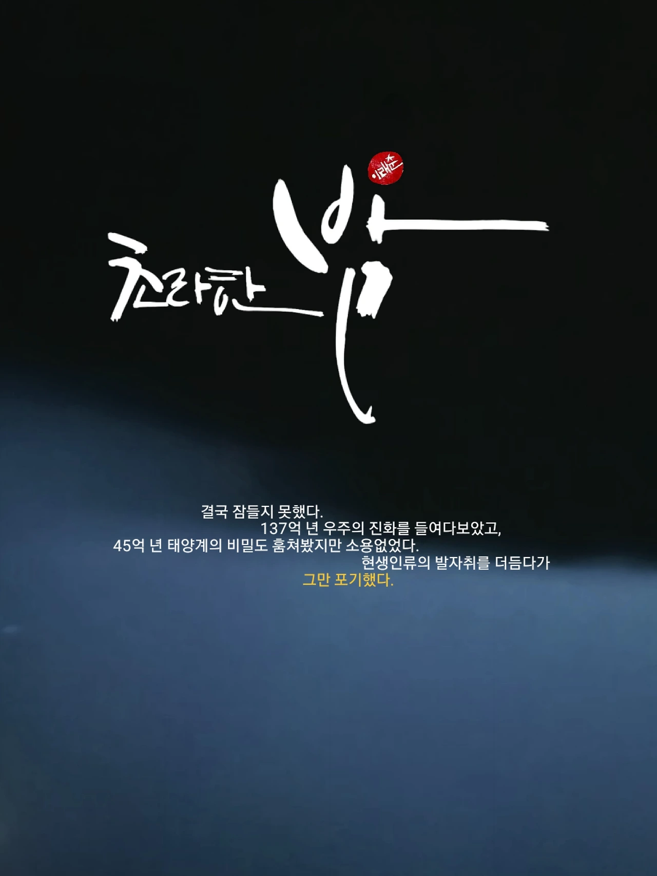 결국 잠들지 못했다. 137억 년 우주의 진화를 들여다보았고, 45억 년 태양계의 비밀도 훔쳐봤지만 소용없었다. 현생인류의 발자취를 따라 초원을 달렸고, 대륙의 어느 골짜기에서 저녁을 맞이하기도 했지만, 동트는 새벽닭의 울음소리에 잠들기를 포기했다. 무릎이 시큰거리도록 밤을 달려 아침이다. 초라한 밤의 끝에도 새벽이 매달렸으니 그나마 다행이다.