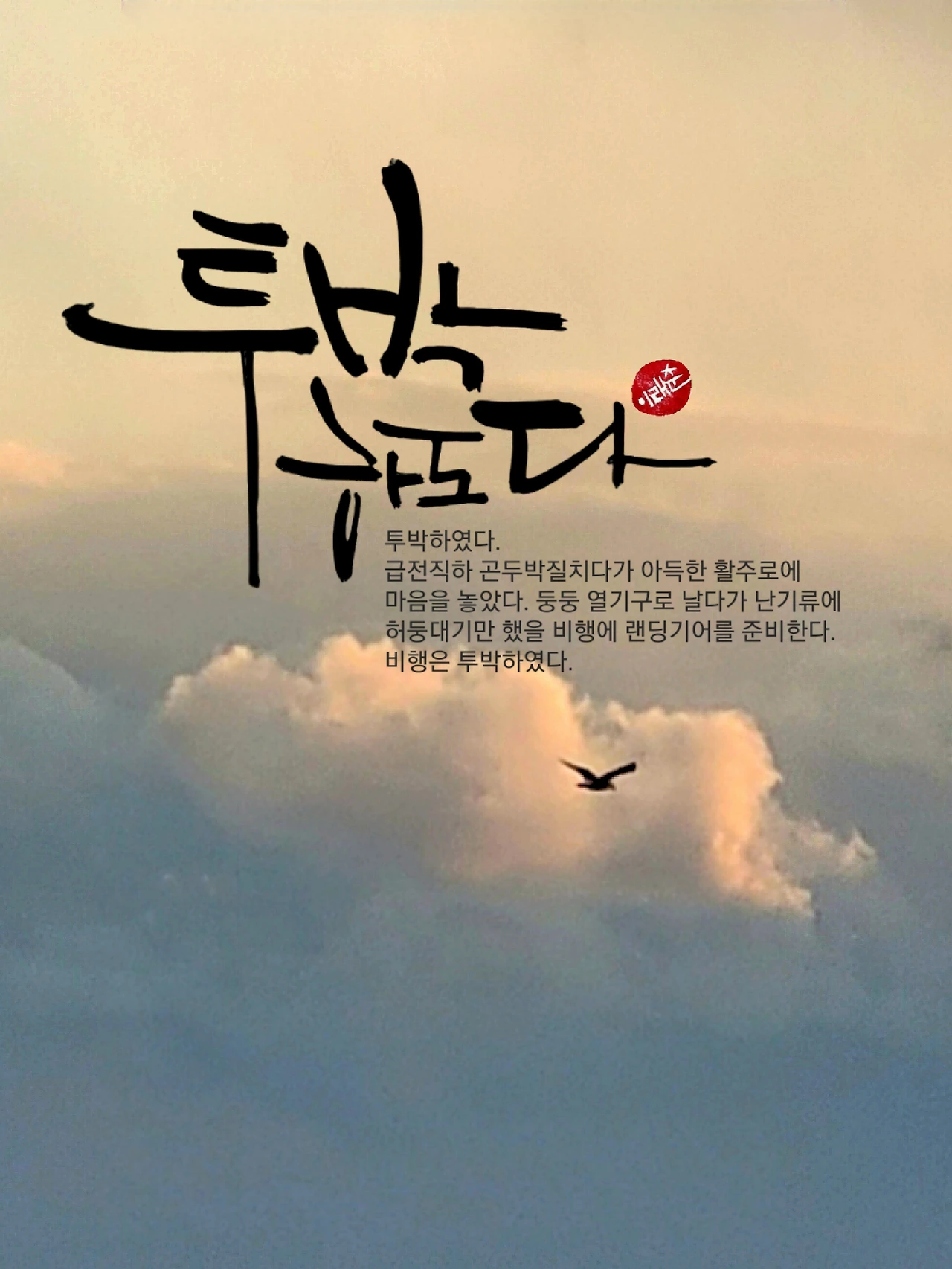 두 번째 비행이었다면.... 생각은 길게 이어지지 않았다. 번갯불에 콩을 볶듯 찰나의 순간을 번쩍이는 생각일 뿐이다. 그랬다면 얼마나 좋을까. 후회를 동반하는 생각은 잘라내야만 했고, 머리를 절레절레 흔들어 쫓아내야만 했다. 가뜩이나 사나운 비행에 풀 죽은 걸음인데 속 시끄러운 생각을 끌어안을 이유는 없다. 누구나 처음이었다. 갔던 길을 되돌아와 오답을 지우고 정답을 쓸 수는 없었다. 아무에게도 다시 고쳐 쓸 기회는 주어지지 않았다. 지나치면 그만이었고 빨간 펜 선생님의 지적질도 없었다. 잠시 잠깐씩 찾아오는 생각에 등 떠밀리는 회한이었다.
