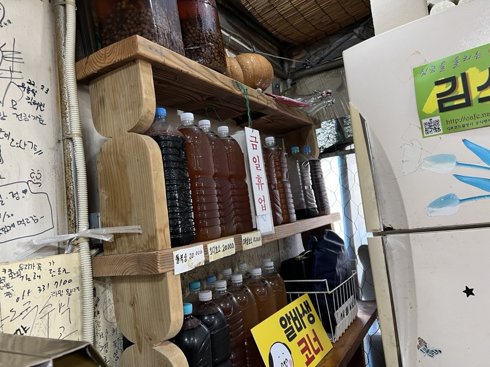 가게 안을 둘러보니 한쪽 벽면에는 여길 다녀간 사람들이 쓴 글들이 가득했고 그 모퉁이로 '청'인지 '진액'인지 '담금주'인지 모를 것을 판매하는 코너도 보였는데 코너 이름이 참 재밌었다.