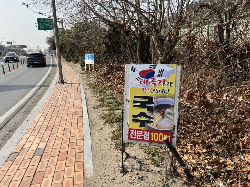 가는 길목 군데군데 서있는 국숫집 간판을 두 개 지나면 마침내 진짜 태극기가 펄럭이고 있는 국숫집이 떡 하고 나타난다.