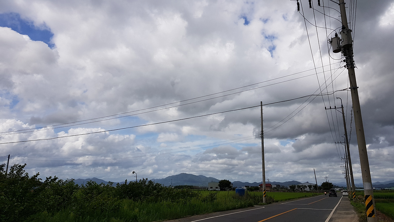저편에선 하얀 구름이 파란 하늘을 미끄러지며 지나고, 이편 하늘에선 회색 구름이 흔들리는 풀위로 그림자를 드리우며 지난다.