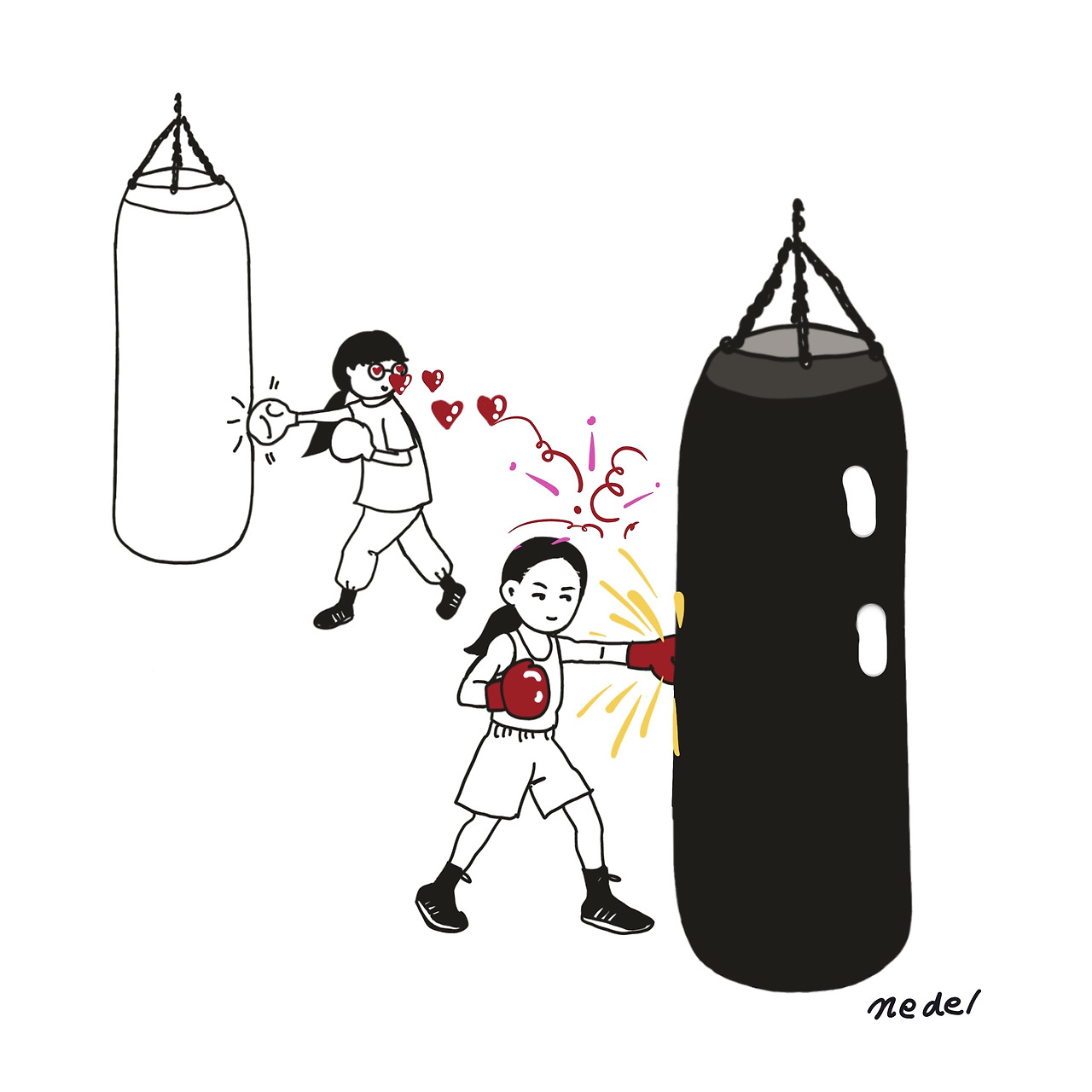 운동 초기에 코치님과 미트 연습을 끝내고 샌드백 연습을 하고 있을 때, 코치님도 내 뒤에서 묵직한 검은 샌드백으로 맹연습 중이었다. 내가 치는 샌드백 소리는 힘없고 둔탁하기만 해서 소리만으로도 기분이 푹푹 꺼졌는데, 코치님의 샌드백 소리는 ‘불꽃놀이’의 하이라이트 불꽃이 팡팡 터지는 것처럼, 빠르고 힘찼고 리드미컬했다.