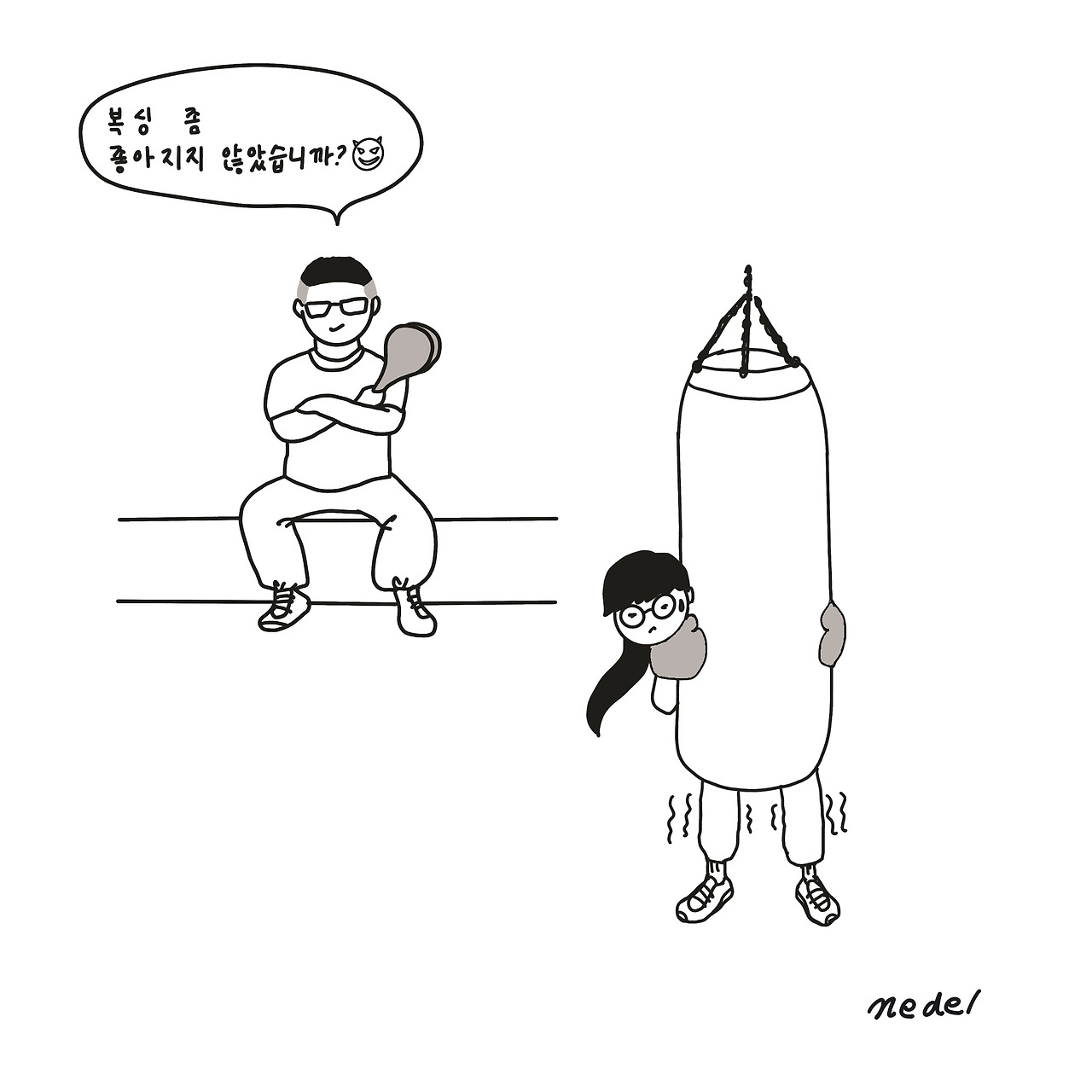 사실, 처음부터 복싱에 집중할 수 있었던 것은 아니었다. 너무나 당연한 얘기지만 복싱은 처음이라 어색한 자세가 이상해서 부끄러웠고, 부끄러울수록 타인의 눈치를 자꾸 살폈다. “아무도 신경 안 씁니다.”라고 관장님이 얘기했지만……. 체육관 거울 속에 어설픈 나와 폼 좀 잡는 한 사람이 동시에 들어가 있었다. 그리고…