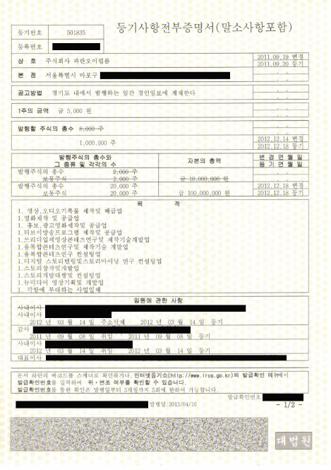 2013년에 발급된 파란오이필름의 법인등기부등본 앞장이다. 사업의 목적 란을 보면 오타들이 발견되는데 법무사가 실수를 한 것이다. 지저분해질것 같아 재등기를 하지않고 놔뒀다.