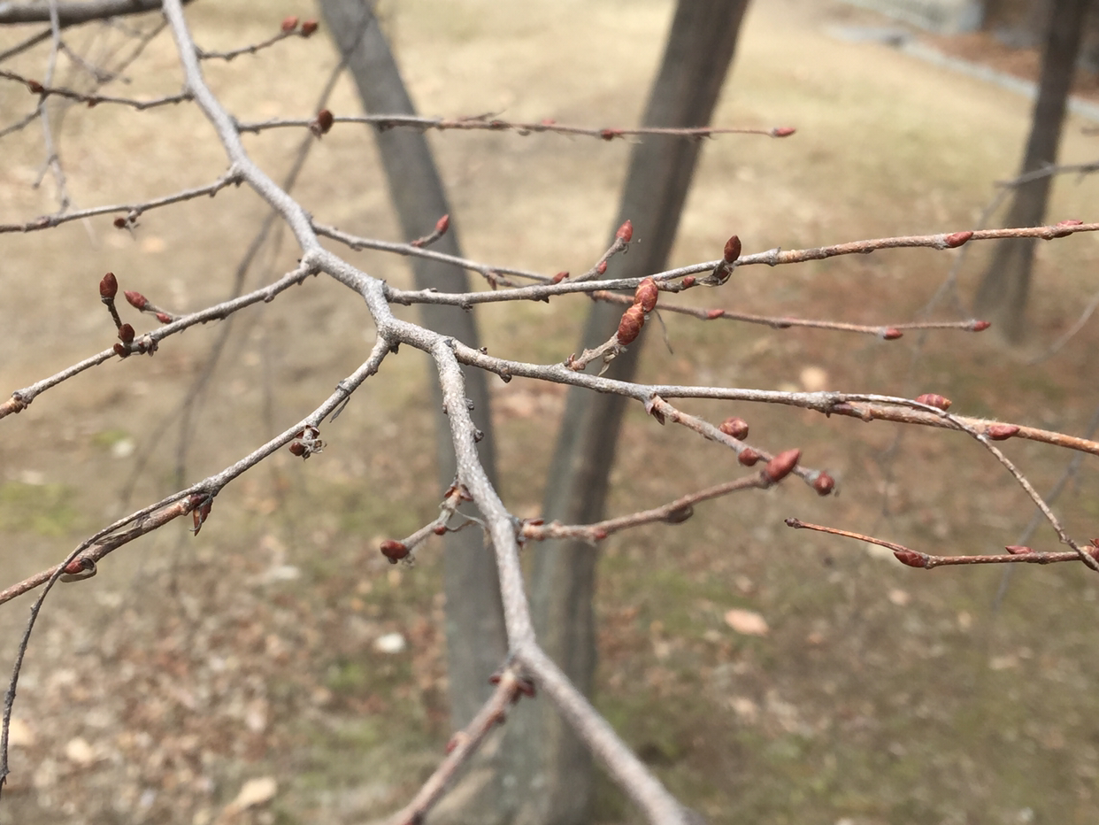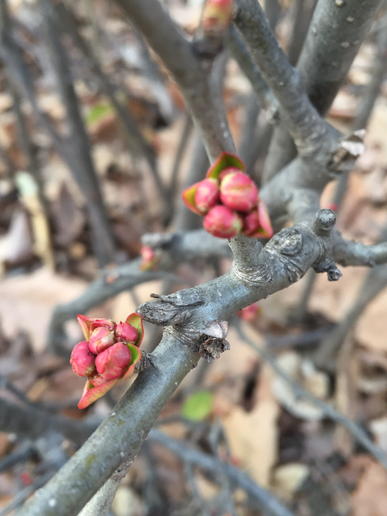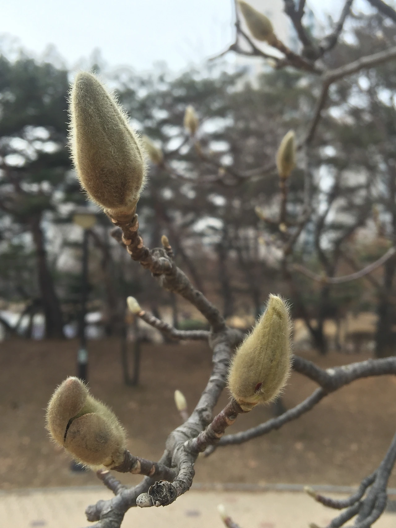 허리를 펴고 보니, 이제 나무들도 시작이다. 잎보다 꽃이 먼저 피는 나무들이 제 색을 드러내는 중이다. 명자나무는 지금이라도 터질 듯한 분홍빛. 꽃이 피고 나면 특유의 예쁜 턱잎도 볼 수 있을 거다. 산수유도 노란 꽃망울이 터지고 있다. 지난해 열매가 아직 직박구리의 간식으로 매달린 채 새봄의 꽃이 핀다. 지금쯤 산에는 산수유꽃을 닮은 노란 생강나무 꽃이 피었을 테지. 잎이 없이 마른 가지에서 터지는 꽃봉오리들이라 더 신기하다. 자세히 보니 철쭉은 모양이 날아오를 태세다. 4월이면 온 동네를 분홍으로 물들일 거다. 하지만, 터지기만 하면 다른 모든 풍경을 압도하리라는 자신감으로 겨울을 난 목련이 먼저다. 아직 단단한 소사나무 겨울눈, 머지않아 반짝이는 연둣빛으로 바탕색을 마무리하겠지.