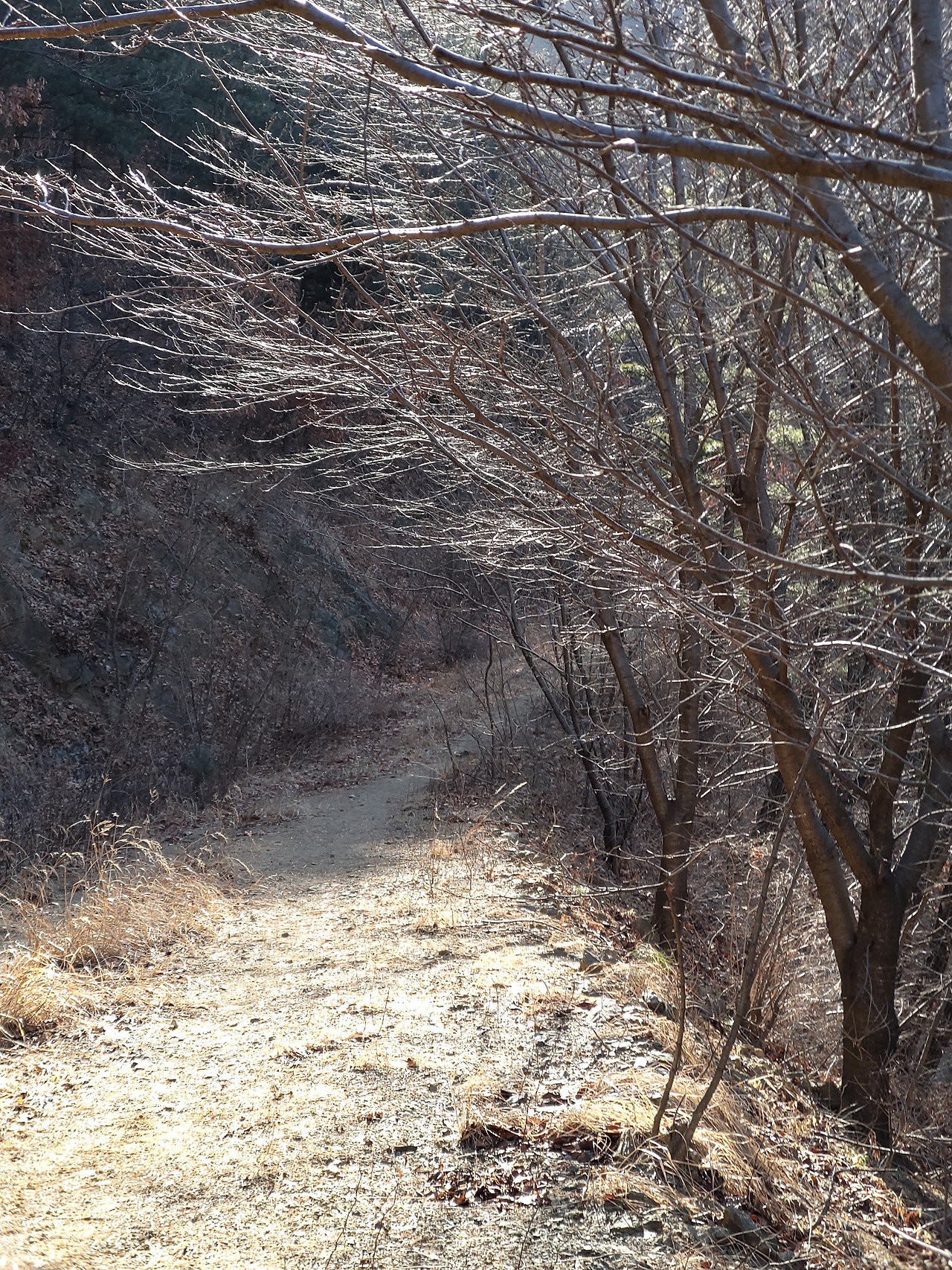 해가 드니 숲이 깨어나기 시작했다. 다 꽁꽁 언 듯해도 생기가 돈다. 비탈에 선 참나무 그룹이 모두 기지개를 켜고, 숲길 좌우로 자리 잡은 국수나무도 국수 가락마냥 꿈틀거린다. 아직 붉은기가 선명한 열매가 몇 알 남은 찔레나무는 찔레꽃 향기마저 날 듯하고 빽빽한 가시가 살벌한 곰딸기 줄기도 냉정하리만큼 무섭지는 않다.