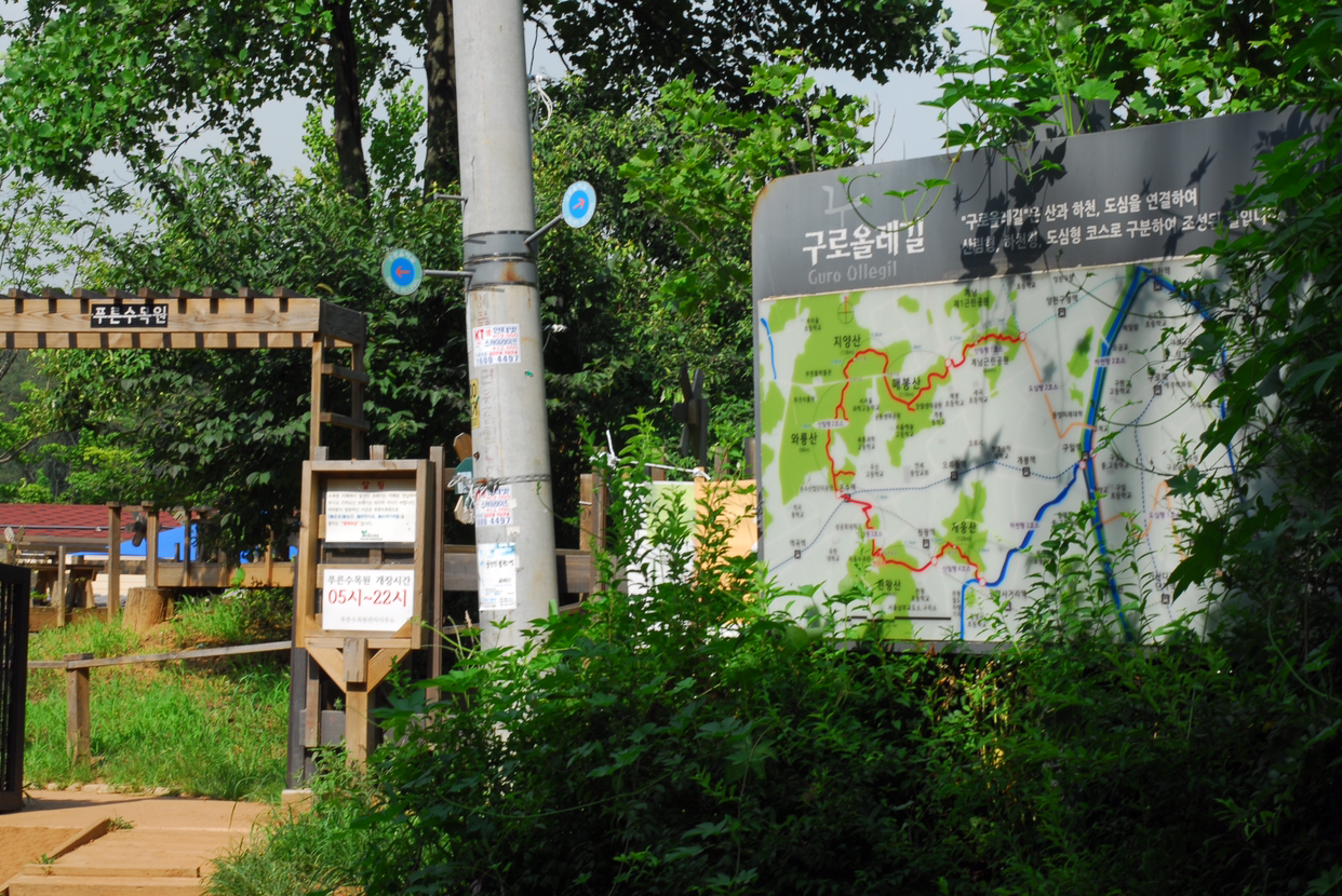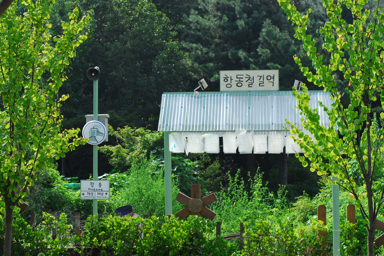 아무튼 철로와 수목원이 포옹할 수 없는 그런 평행선이이 아니란 건 다행이다. 철길을 따라 계속 걸어가면 식물원으로 들어갈 수 있는 공식적인 쪽문이 나온다. 작은 사거리라고 할 수 있는 이곳에서 곧장 가면 오류역 방향, 오른쪽으로 난 산길은 구로올레길. 왼쪽으로 쪽문이 마치 시골 초중학교의 뒷문처럼 괜히 정겹다. 이런 문으로 남몰래 다니고 싶어진다. 이건, 군자는 못 된다는 증거? 이렇게 해서 철길은 푸른 수목원의 컨텐츠가 되었다. 결정적으로 철로 컨텐츠의 완성은 '푸른수목원' 간이역. 언제나 철길 풍경의 최종은 간이역이었지.