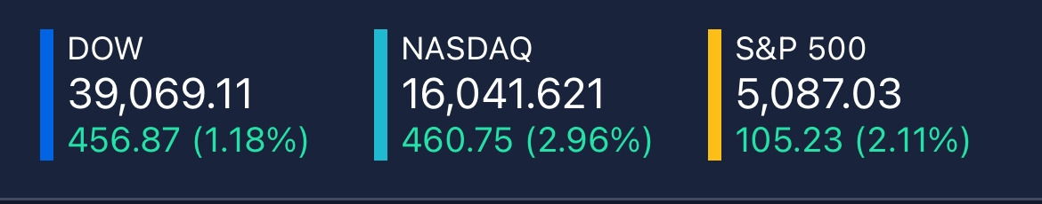 최근 며칠 하락세를 복구하는 폭등세. AI 관련/반도체 관련 종목의 급등세.