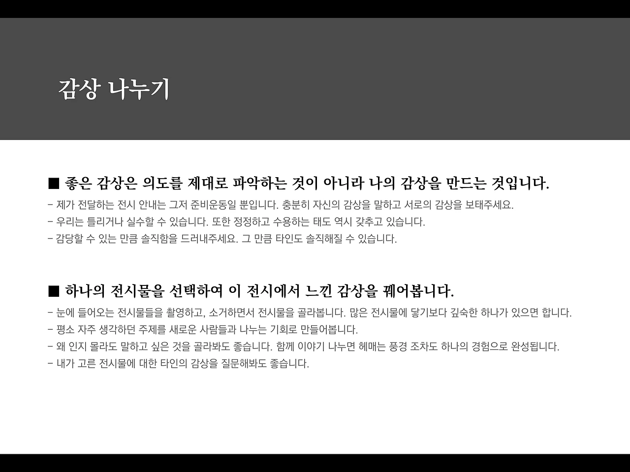 왜 인지 모르겠지만 이상하게 자주 생각했던 주제가 있지요? 맘에 밟히는 주제. 분명 고르고 고르다 보면 그 주제와 닿는 전시물이 생길 겁니다. 전시물과 함께 그 이야기를 전해주세요. 바로 세 번째 전시를 살펴볼 때입니다. 평소에 뜬금없이 내 머릿속에 있지만, 다른 이들에게 공유하기 애매했던 것들 말이에요. 감상을 나누는 자리에서는 잘 묵혀둔 본인 만의 주제를 꺼내는 것은 다른 분들의 감탄을 이끌어낼 거예요. 결론이 나지 않았던 문제라도 꺼내두면 분명 새로운 시각으로 조명할 수 있어요. 사람들과 함께하면 헤매던 그 질문의 풍경조차도 하나의 경험으로 완성됩니다. 그러니 충분히 이야기를 풀어내 주세요. 많은 전시물이 닿기보다는 정확히 닿은 전시물에 대한 이야기를 길게- 길게- 들려주세요. 여기에 다른 분들의 의견을 곁들이면 우리는 우리 앞의 전시물을 오래 기억에 남길 수 있을 겁니다.