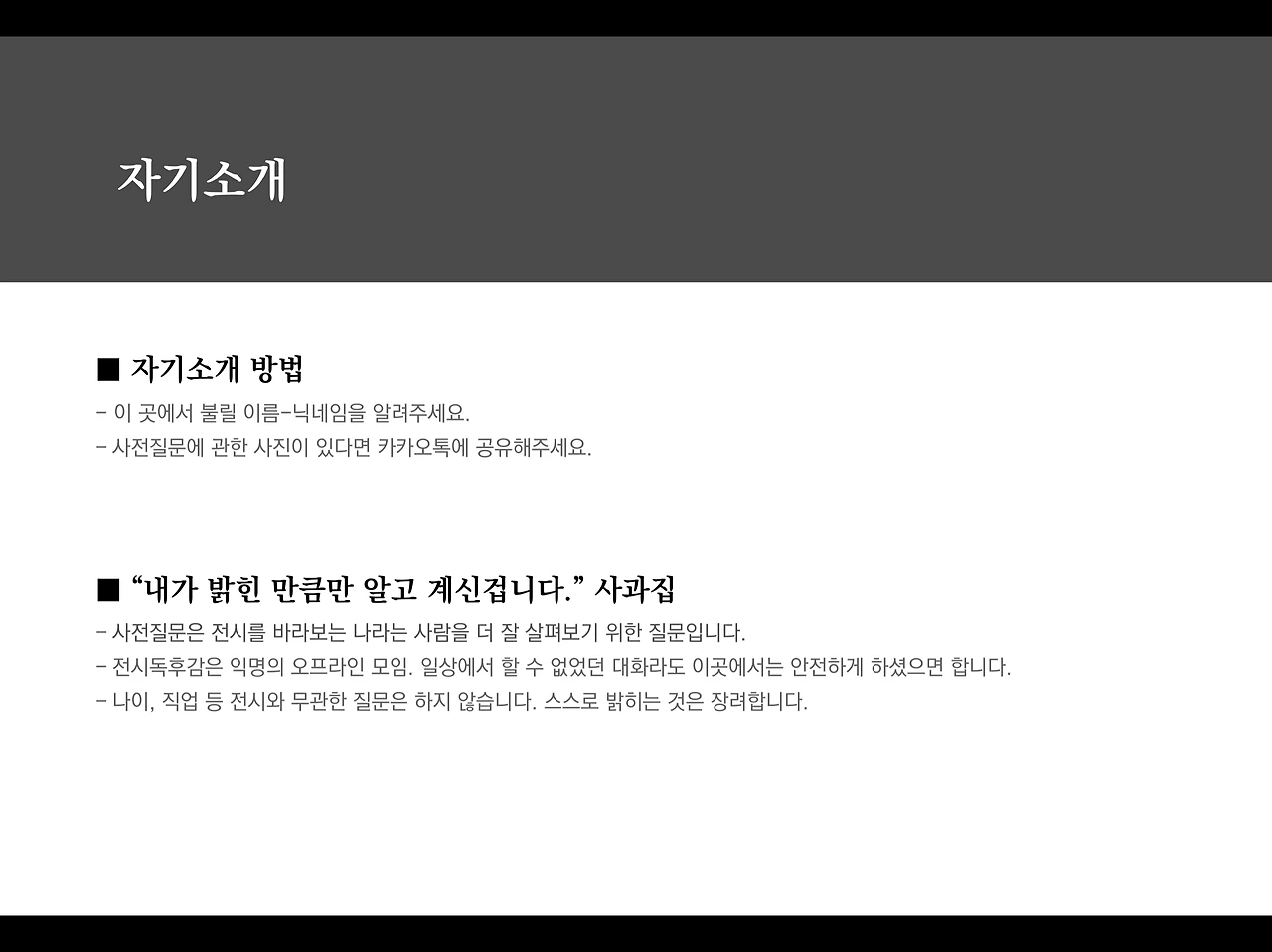 자기소개를 대신하는 답변은 일단 나이, 직업, 관람의 사전지식과 무관한 질문입니다. 기본적으로 전시독후감은 '익명의 오프라인 모임'이라고 생각하고 있어요. 평소에 자신을 바라보는 시선에서 벗어나서 나라는 사람의 감각, 감상을 표출할 수 있었으면 합니다. 그러니 전시독후감에서는 스스로가 생각하는 자신으로, 짧은 명사가 아니라 무엇을 어떻게 감각하는 사람이었으면 합니다. 그래서 직접적으로 나이, 직업, 사전 지식을 묻지 않습니다. 대신 자신의 정보와 감상을 말하는 건 장려하고 있어요. 그러니 함께 하시는 분들도 타인의 신상에 대한 질문을 던지기보다는 나의 감상을 중심으로는 깊숙하고 솔직하게 이야기해 주세요. 다른 이의 감상을 듣고 감상을 보태거나 질문을 할 때는 상대방이 말했던 것을 중심으로 대화를 이어가주세요.