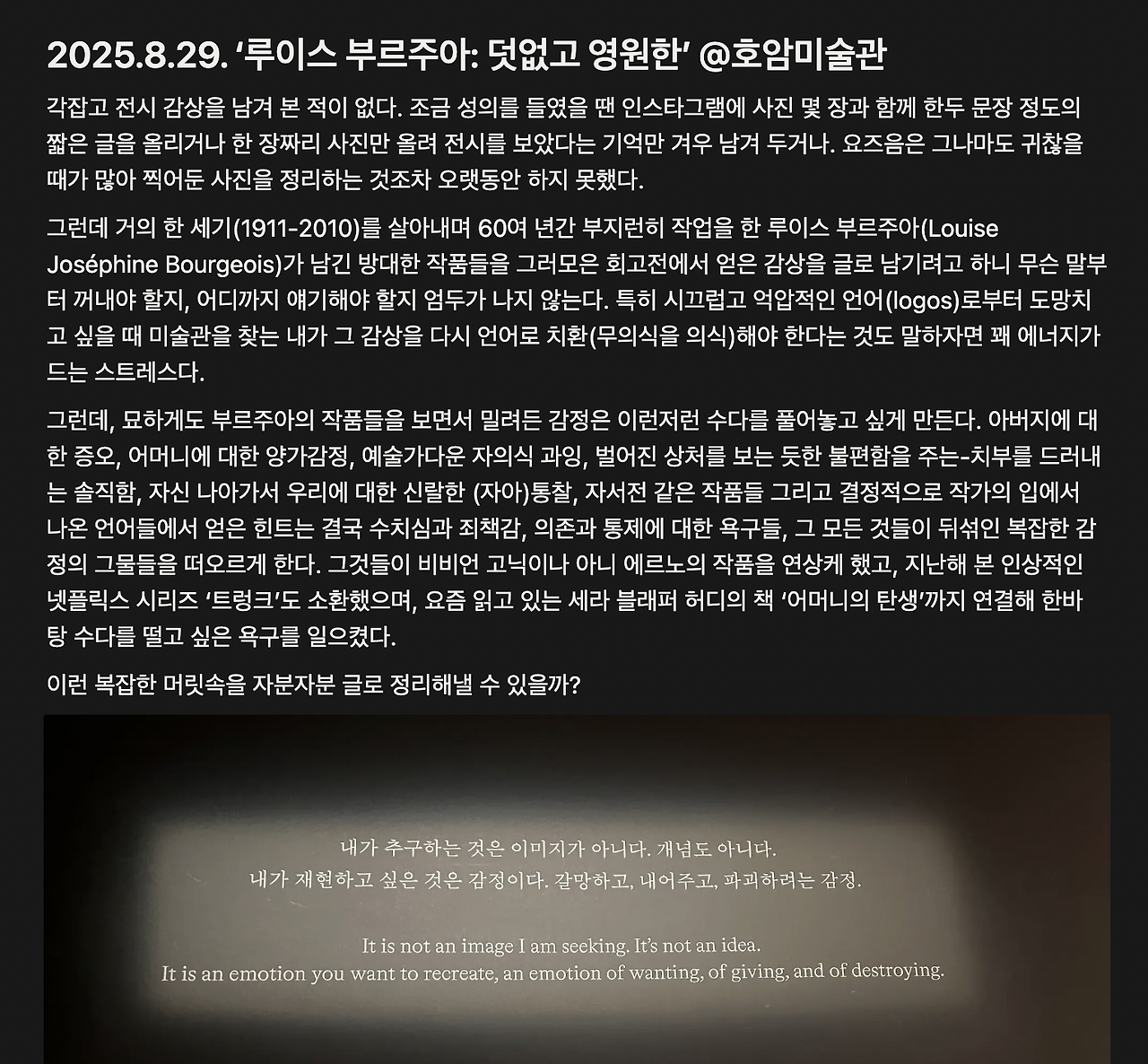 전시를 요약하기보다, 그 순간의 나를 남겨두는 것이 더 중요합니다.