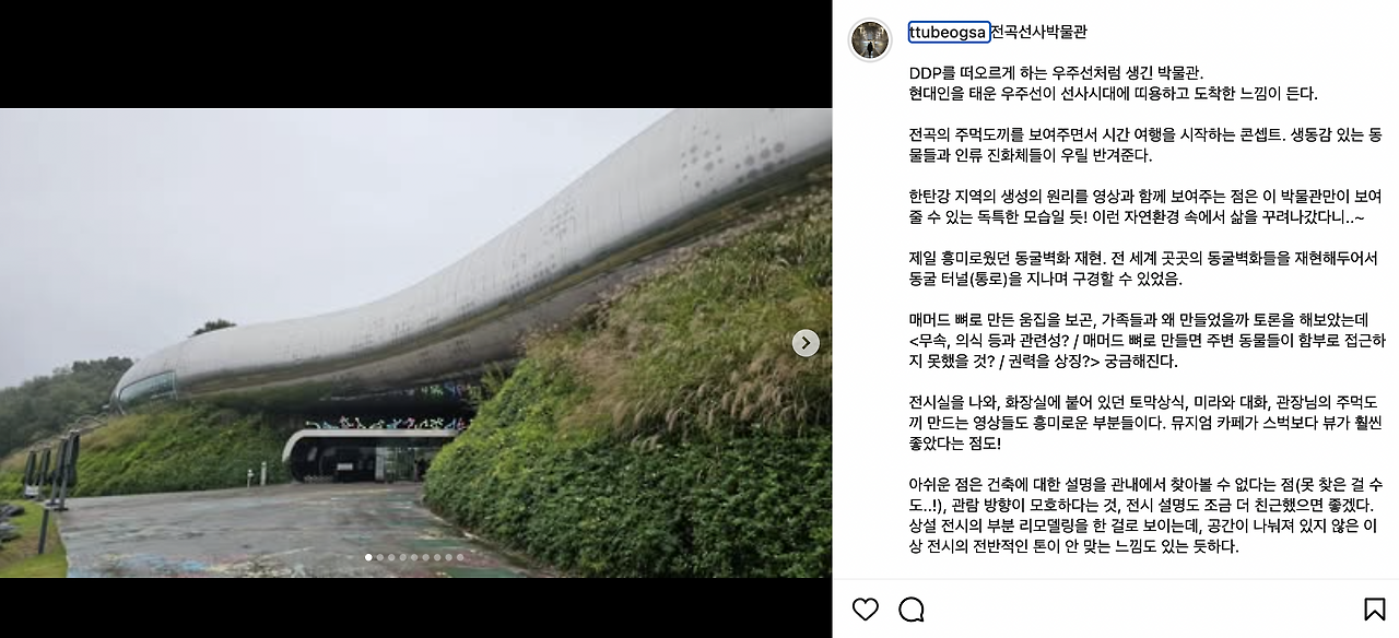 세 개의 리뷰를 남겨주셨는데~ 개인적으로는 전곡선사박물관 리뷰가 좋았습니다. 좋은 점과 아쉬움 점도 함께 나눠주셔서 이 사람이 궁금한 지점은 이런 것이구나~ 싶기도 했고요. 전시실에 진입하기 전부터 관람 이후의 감상까지 이어지는 흐름을 따라가는 재미가 있었어요. 뚜벅사님은 제가 이 리뷰모임을 할 때 가장 먼저 떠오른 사람인데요. 뚜벅사님의 리뷰를 좀 더 생생히 들을 수 있는 것이 제가 이 모임을 하는 동기 중 하나입니다. 이번에 공유해주신 리뷰 뿐 만아니라 평소에도 많은 리뷰들 남겨주시니까, 함께 살펴보시는 것 추천드립니다! 나누어주셔서 고맙습니다~