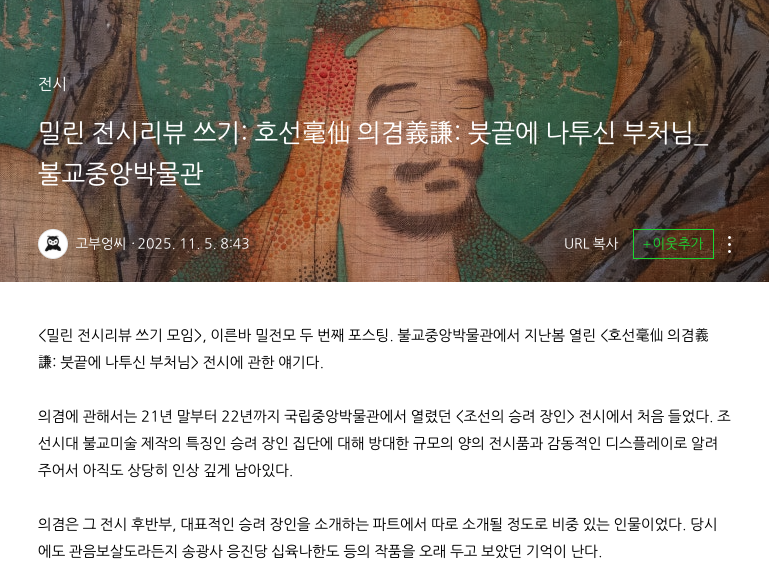 좋아하는 사람만 관심을 갖고 발견할 수 있는 부분이 있습니다. 기대하기도하고요. 이번 리뷰는 그런 마음이 느껴졌습니다. <조선의 승려 장인>이라는 전시를 통해 전시에 대한 흥미가 높아졌다는 부분도 좋았어요. 그러니까 이 전시에 대한 호기심 역시 더 잘 이해가 갑니다. 이건 이렇게, 또 저건 요렇게 해보면 좋겠다 싶은건 아주 적극적인 표현이니까요. 왜 아쉬운지 그래서 어떤 부분을 강조하면 좋겠는지 구체적으로 서술해보는 건 도움이 됩니다. 당장 이 전시가 리뷰처럼 바뀔 수는 없다고해도요. 최소한 리뷰를 쓰는 나 자신은 무엇을 기대했는지 반추할 수 있거든요. "아...! 나는 이런 정보를, 이런 관점을 원했던 거구나!" 보는 사람이 구체적으로 말해주는 건 만드는 사람에게도 큰 도움이 됩니다. 앞으로 제가 여러 번 반복할지도 몰라요. 그리고 구체성이 있는 감상은 좋은 것을 찾는 순발력있는 판단을 높이는 것에 도움이 됩니다. 좋은 것들을 더 많이 볼 수 있는 세세한 감상 나누어주셔서 고맙습니다~