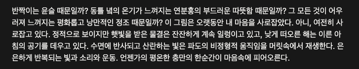 그림이 참 멋집니다. 꽤 오래 전에 보았던 그림인데, 잊혀지지 않아서 기록을 해보겠다고 말씀하셨을 때 충분히 그럴 수 있겠다는 공감이 들었어요. 저도 한참 바라보게 되는 매력있는 작품이라서 실물을 보고 싶다는 생각이 들었습니다. (이게 상투적인 감상일지도 모르겠지만... 저는 사진으로 자주 만족하는 편입니다.. ㅋㅋ)