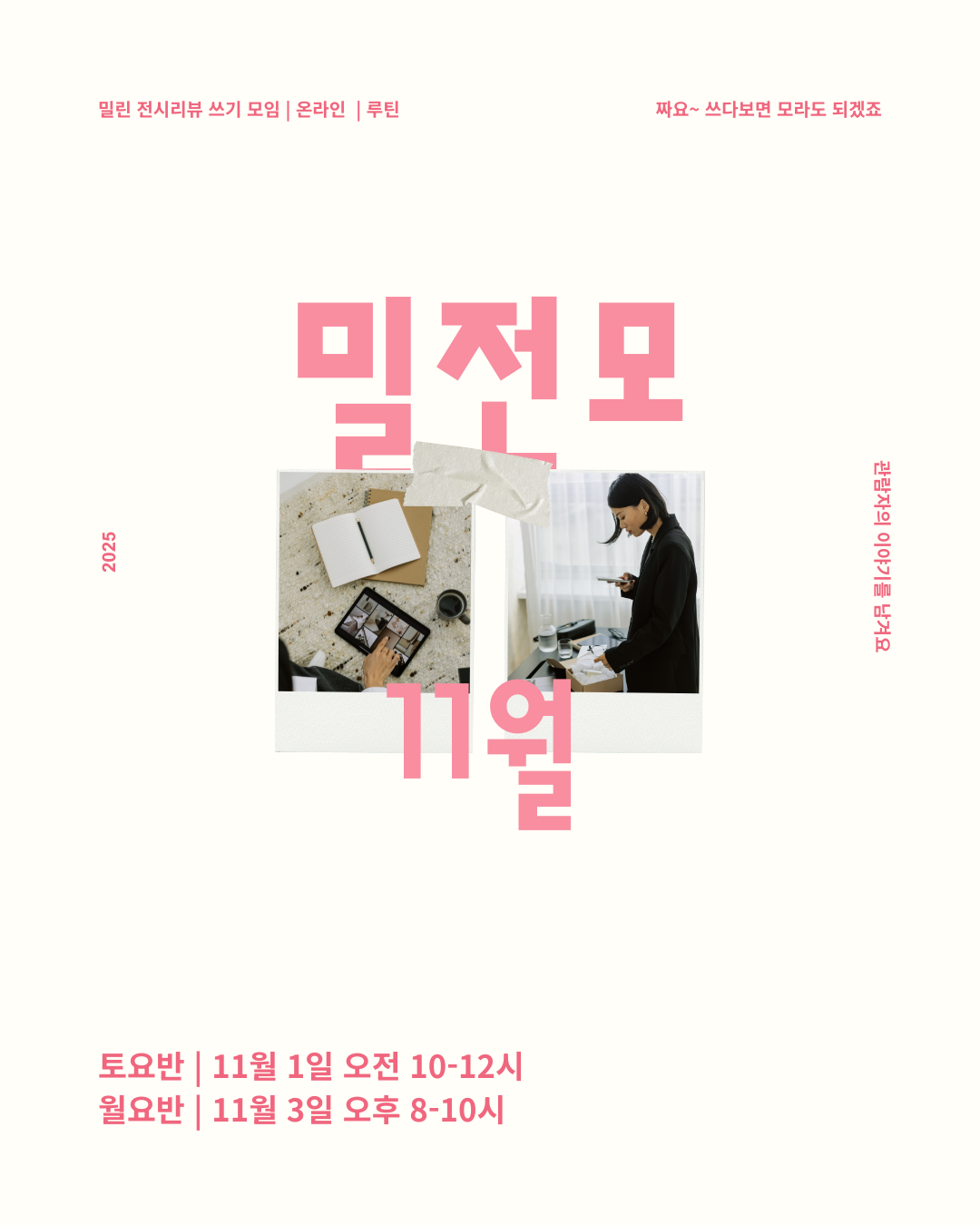 #밀전모 | 밀린 전시 리뷰 쓰기 모임은 전시를 만드는 사람보다 보는 사람의 목소리를 기록하는 공간입니다. 함께 전시 경험을 글로 남기고, 관람자의 이야기를 이어가요.