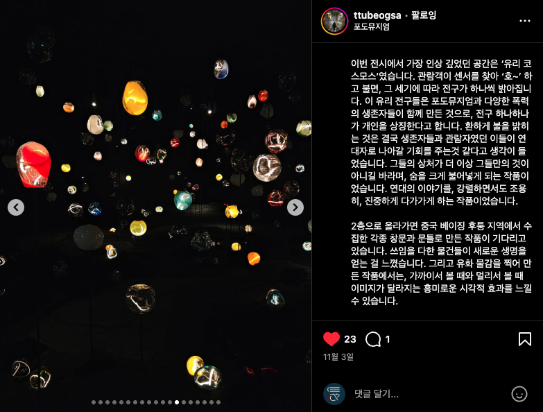 포도뮤지엄, 저도 한 차례 방문했을 때 기획력이나 작업 설치 방식에 큰 감명을 받았었는데요. 바뀐 전시도 여전히 탄탄한 기획력과 작업들이 자리하고 있네요. 한 시간 반 정도 같이 작성하는 시간을 갖기 때문인지 몰라도 평소 리뷰보다 훨씬 긴 글인데요. 전시 장면의 전환을 포함해서 작업을 묘사해주셔서 함께 동선을 이동하는 것처럼 글을 읽었습니다. 개인적으로 사회참여적인 작업들을 좋아하는데요. 작업 자체가 사회적 메시지를 가진 것들이 많아서 여러번 살펴보기도 했습니다. 그치만 무엇보다 계속해서 시선을 사로잡는 매력적인 작업들이라서 그 메시지가 다가오는 것이라고 생각합니다. 시선을 끌고 또 오래 생각하며 걷는 기분으로 리뷰를 통과했습니다. 감상 나누어주셔서 고맙습니다~