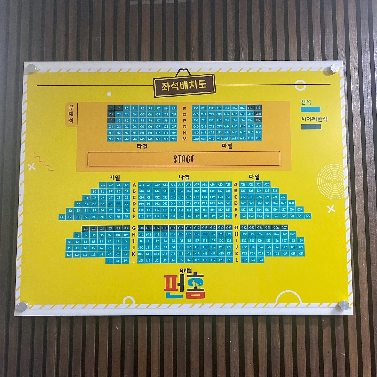 티켓팅 하면서 무대석이 어떤 건가 궁금했는데, 무대랑 구분되어 있어서 꽤 괜찮다! 정확하게는 무대 건너편? 무대석1열=중블1열. 의자가 좀 간이의자다. 배우들 동선 생각하면 중블보다 낫지 싶다.