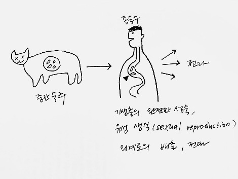 위 그림의 1번부터 천천히 생활사를 읽어나가기 시작해보자. (중간숙주-유충, 종숙주-성충, 충란. 만 기억하자)