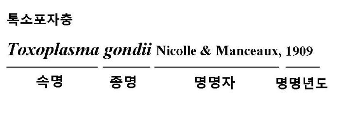 우리나라에서는 '고양이 기생충' 이라고도 불리는 '톡소포자충'의 학명이다. 톡소포자충의 학명은 속명인 Toxoplasma, 종명인 gondii, 그리고 명명자 (Nicolle & Manceaux)와 명명년도 (1909)로 이루어진다. (기생충의 발견년도는 1908년이다)