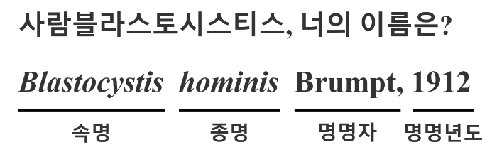 과거, Blastocystis라는 학명이 (추측대로) 효모의 특징으로 지어진 이름이라고 한다면, 학명 속에 숙주 (발견원)의 정보와 함께 ‘실수로 잘못 붙여졌던 이름표’도 함께 갖고 있는 셈이다.