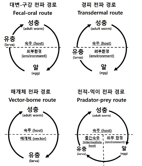 연충류의 전파 방식은 위의 표처럼 크게 네 가지로 분류할 수 있다. 앞서 배운 '알-유충-성충' 세 가지 발육 단계를 생각하며 전파 방식에 대해 알아보자 [2,6].