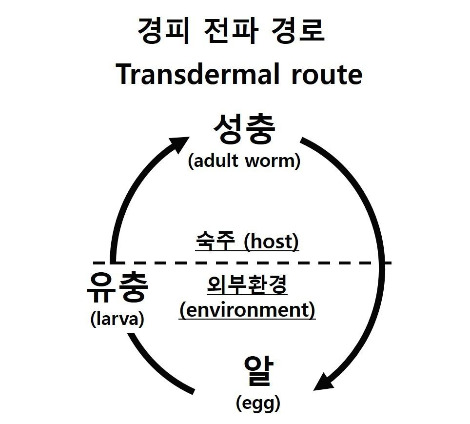 감염된 유충은 숙주의 조직을 통해 장(腸)으로 이동하고, 이후 성충으로 발육하여 유성생식을 통해 알을 산란하게 된다. 산란된 알은 숙주의 배설물을 통해 배출되고 이후 외부에서 부화한 유충은 다시 다른 숙주의 피부를 통해 감염하여 생활사를 이어간다. (대표적인 경피 전파 생활사를 갖고 있는 구충의 생활사 click [8])