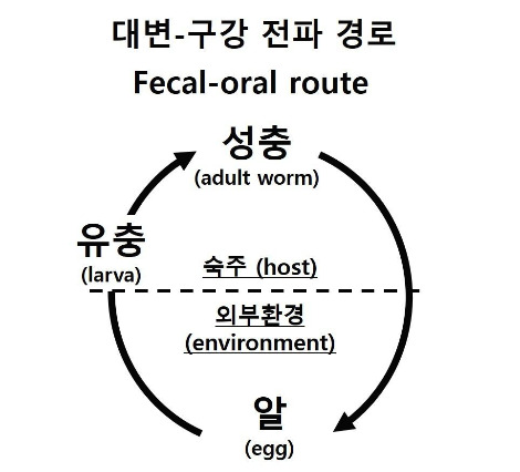 이후 배출된 알은 외부(흙)의 적합한 환경에서 부화 전의 상태로 발육되다가, 음식/물과 함께 숙주의 입을 통해 장 내로 이동하여 부화하게 된다. 이후 부화된 유충은 숙주 내에서 성충으로 발육하여 유성생식을 통해 알을 만들고 또다시 산란하며 생활사를 이어간다. (대표적인 대변-구강 전파 생활사를 갖고 있는 회충의 생활사 click [7])