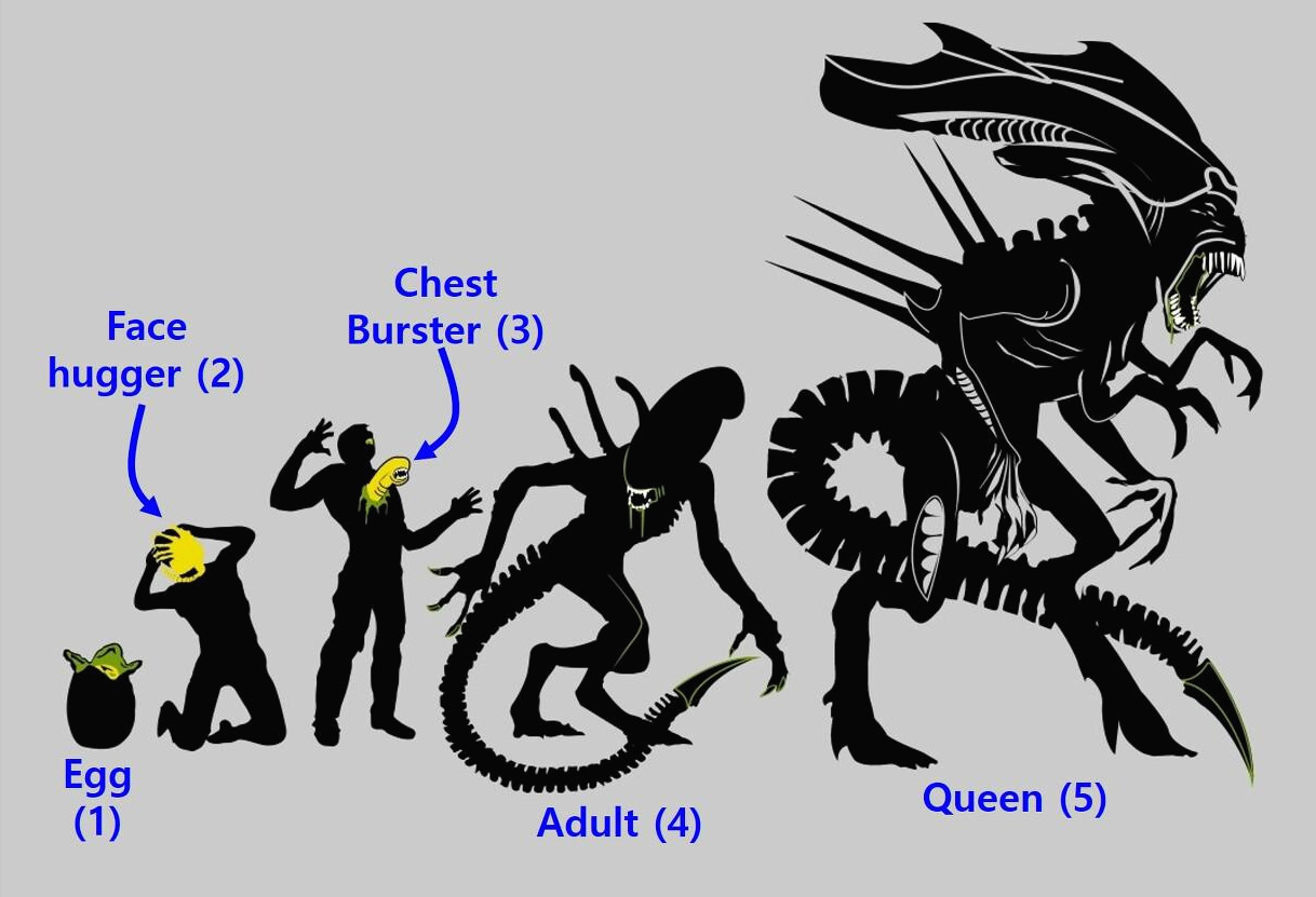 위 그림은 기생 (parasitism)을 중요한 이야기의 테마[4]로 갖는 영화 '에일리언'에 나오는 외계생명체 제노모프(성체)의 발육단계를 일러스트로 나타낸 그림이다. 영화 속 에일리언의 생활사는, 퀸에일리언이 낳은 알(1)에서 나온 페이스허거(2)가 사람(숙주)의 입을 통해 유충을 주입하고, 이후 숙주의 몸을 뚫고 나온 유충 체스트버스터(3)가 자라 제노모프 성체(4)가 되는 설정이다. 실제로 영화 에일리언은 자연계 속 기생벌의 기생 방식에서 영감을 얻어 탄생했다고 한다 [5].