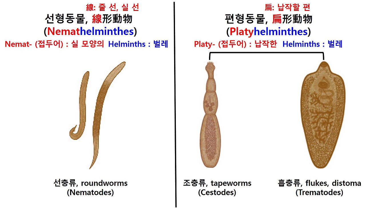 마찬가지로 편형동물(扁形動物)은 '납작한 모양(扁形)의 동물(動物)'이라는 뜻으로, 영어로는 '납작한'이라는 뜻의 접두사 (Platy-)와 '벌레'의 'Helminthes'가 합쳐져 Platyhelminthes라고 부른다. 위의 그림 속 대표적인 기생충들의 모습만 보아도, 이름을 꼭 빼닮은 실 모양의 선형동물(선충)과 납작한 모양의 편형동물(조충, 흡충)을 구분할 수 있다! (음식으로 비유하긴 조금 그렇지만, 이해하기 쉬운 예를 들자면 기다란 곱창과 납작한 편육을 생각하면 좋을 것 같다...)