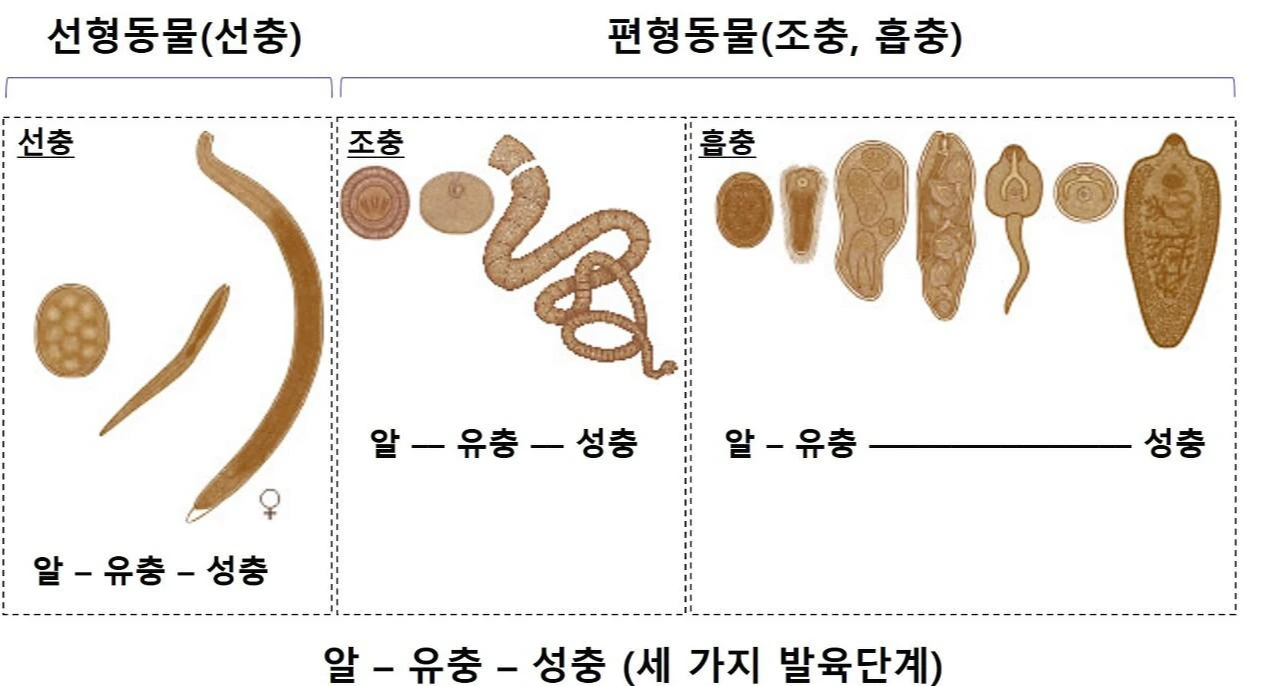 이제 앞으로 (대표적인 연충류인) 선형동물에 속하는 선충과 편형동물에 속하는 흡충, 조충에 대해 자세히 알아볼 것이다.