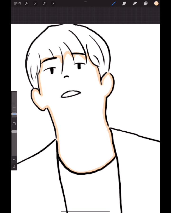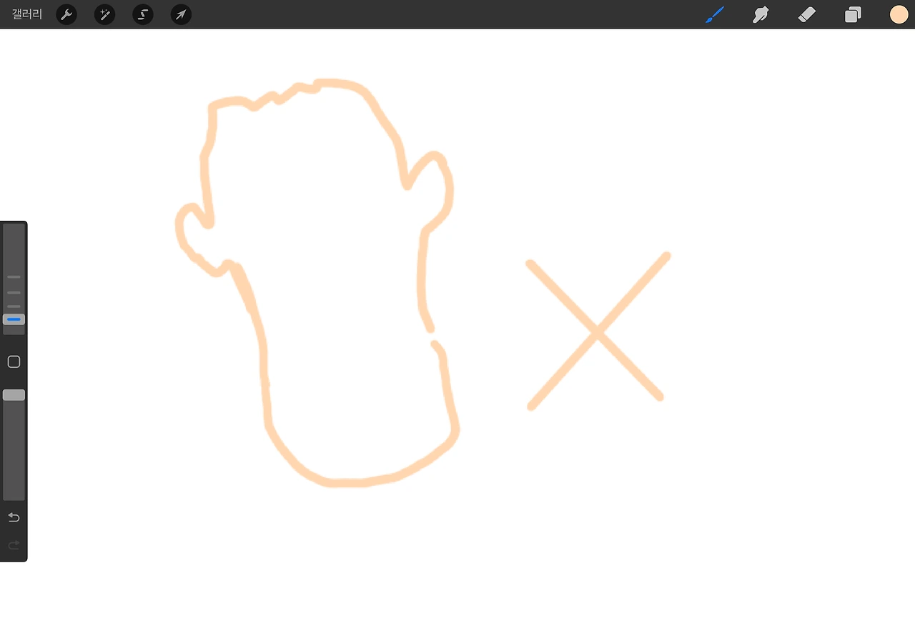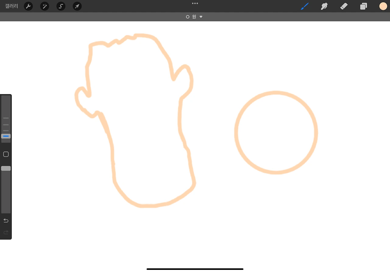 이렇게 닫힌 모양으로 만들어야 하는 이유는 프로크리에이트가 제공하는 자동 색 채우기 기능을 활용하기 위함이다. '컬러 드랍' 이라고 불리는 기능인데, 이름 그대로 색을 끌어와서 정해진 공간에 떨어뜨리면 된다.