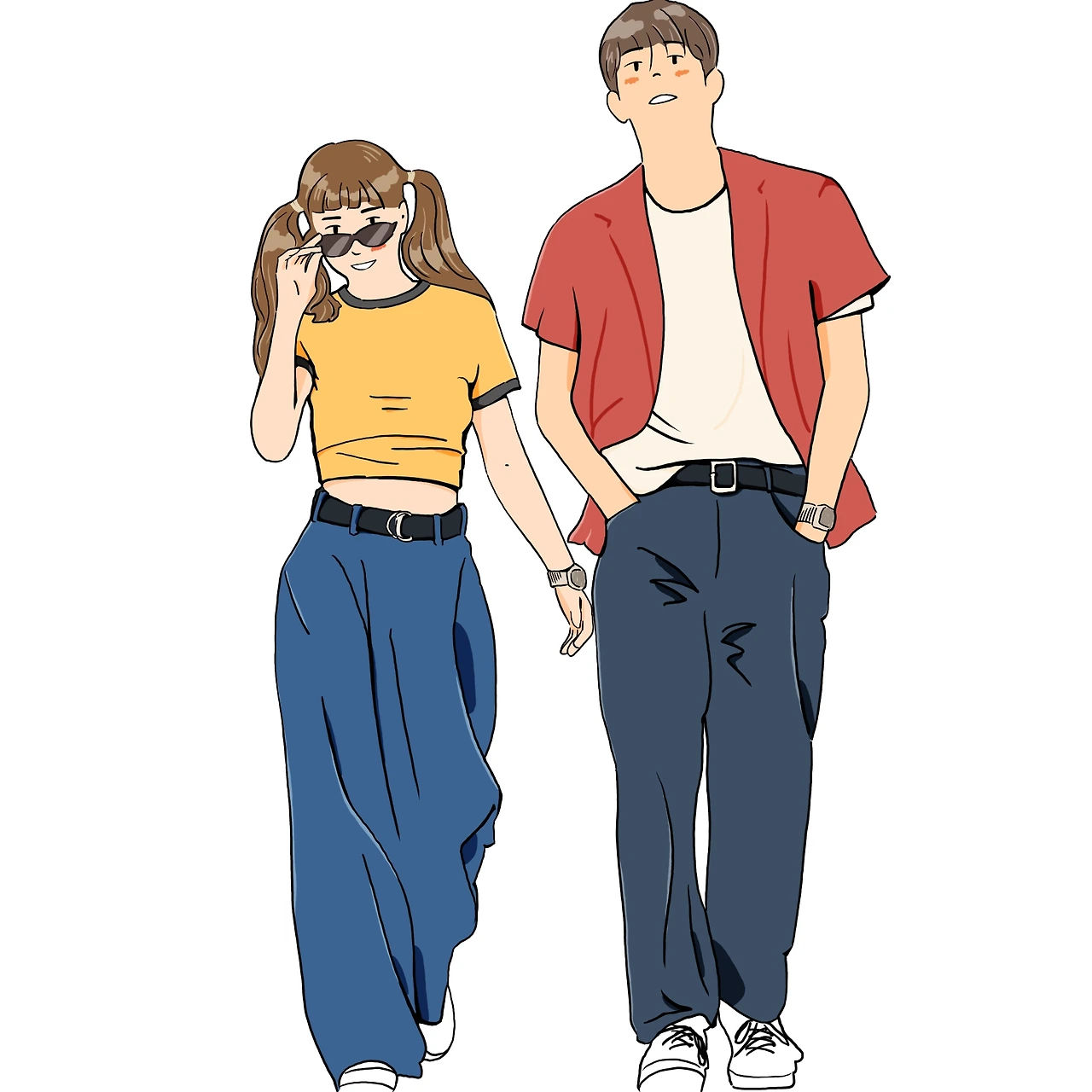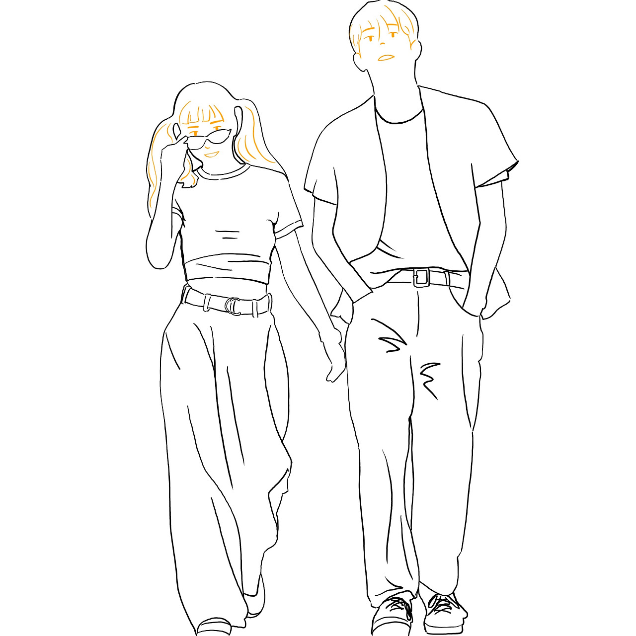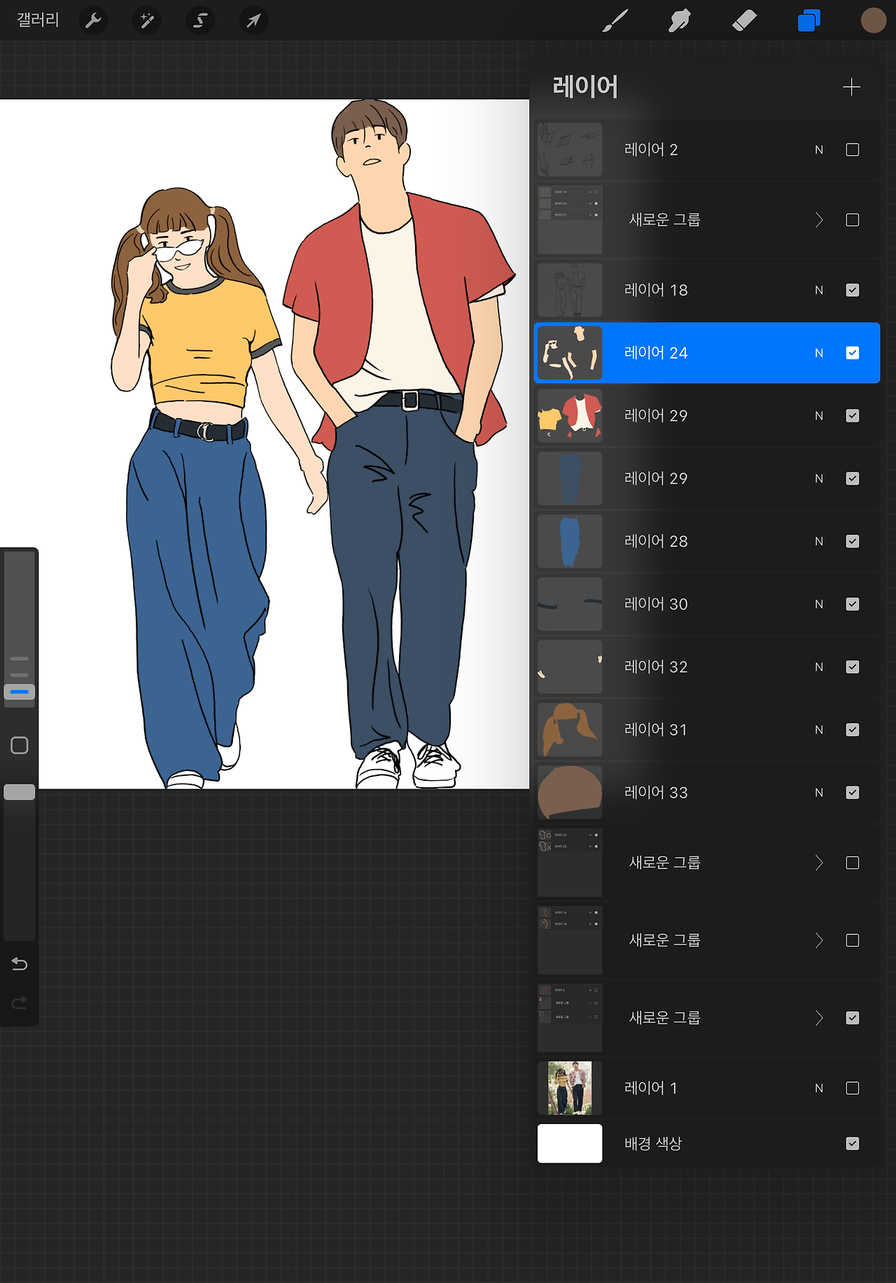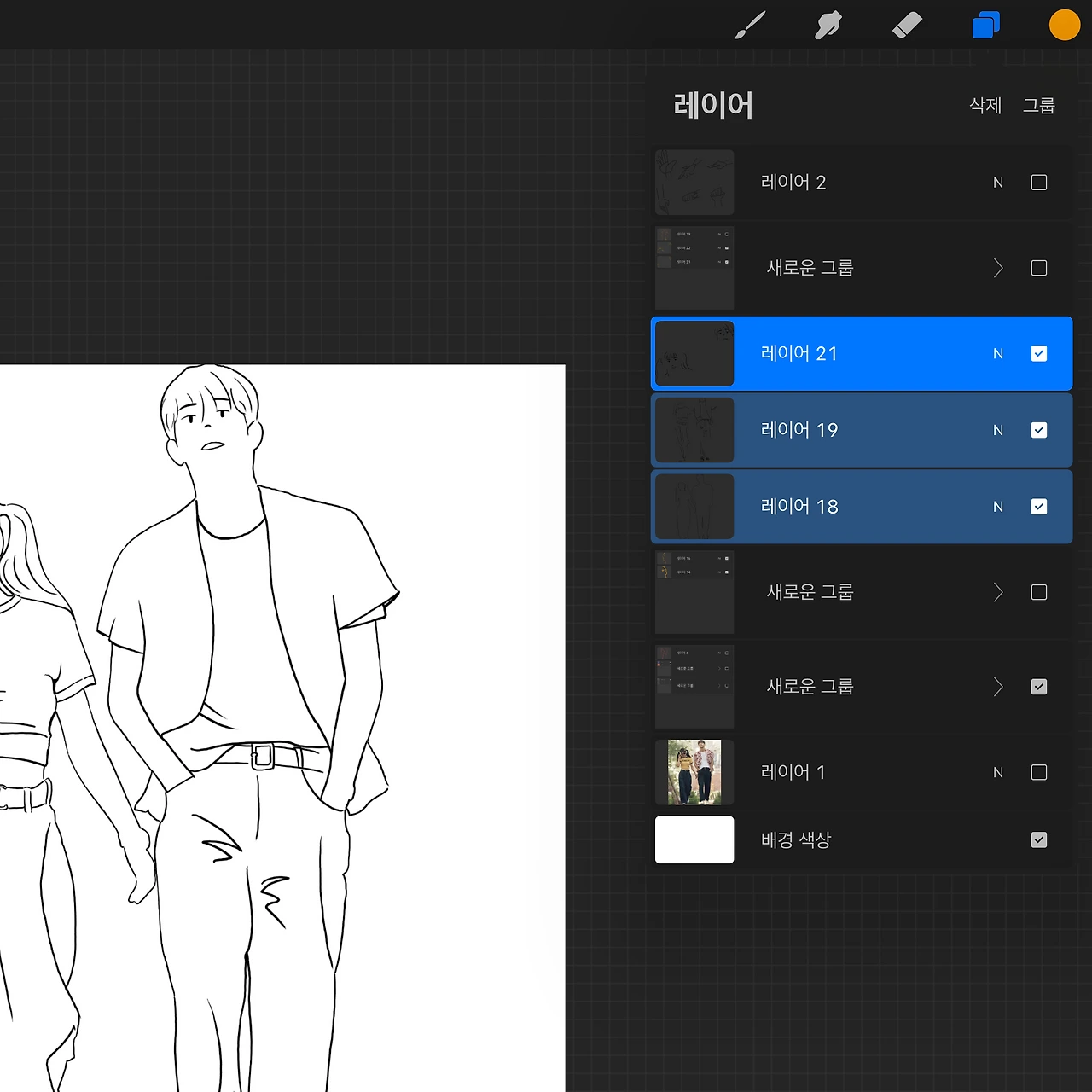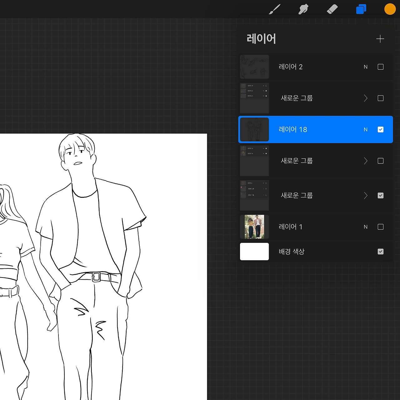 아래에 있는 레이어는 위에 있는 레이어에 가려진 부분만큼 보이지 않는다. 예를 들어 위의 김태리와 남주혁의 앞머리 부분을 보자. 머리카락 레이어가 얼굴 레이어보다 아래에 있기 때문에 얼굴에 가려지는 부분은 테두리를 직선으로 긋고 색을 채워도 된다.