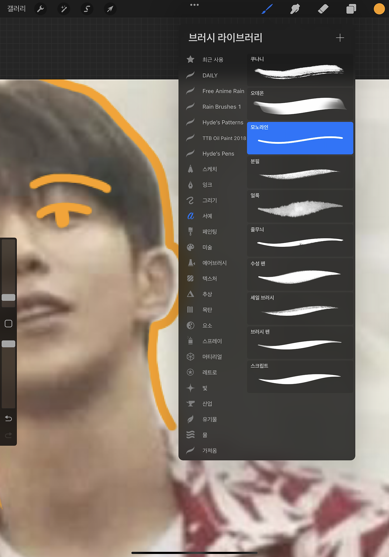 채색을 하기 위해 약간의 '고급기술(?)'을 사용할 것이다. 브러쉬를 [모노라인]으로 바꿔주자. [모노라인]으로 스케치를 했던 선생님들께서는 그대로 사용하면 된다.