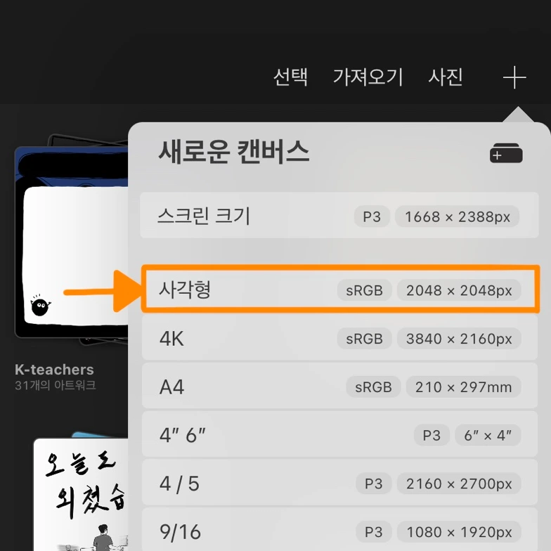 오른쪽 상단에 '+' 버튼을 누르고 '사각형 (2048x2048)' 을 누른다.
