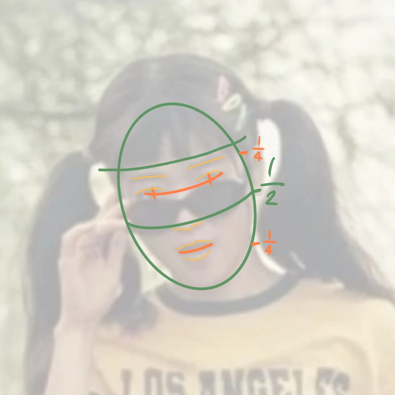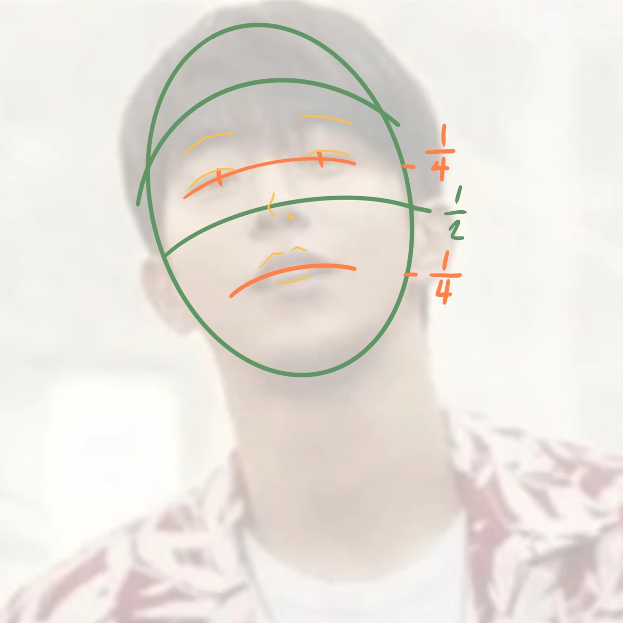 가장 어려운 얼굴 그리기 부분이다. 물론 연예인의 얼굴이지만 대부분의 사람들은 이렇게 생겼다. 얼굴을 크게 달걀형태의 타원으로 보고 윗부분을 잘라내 보자. 코가 가운데 1/2 지점, 남은 면적의 각각 1/2 지점에 입과 눈이 있다. 정확한 비율을 지키지 않아도 대략 이 위치에 눈과 코와 입을 가져다 두면 자연스러워 보인다. 그림 그릴 때 참고하자.