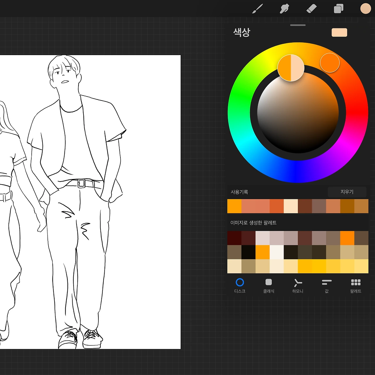 새롭게 레이어도 추가했고 브러쉬도 모노라인으로 바꿨다. 먼저 피부색을 칠하고 옷을 칠하자. 피부색은 다음과 같이 만들면 된다. 노란색과 빨간색을 섞어 만든 주황색에서 밝은 톤을 선택한다.