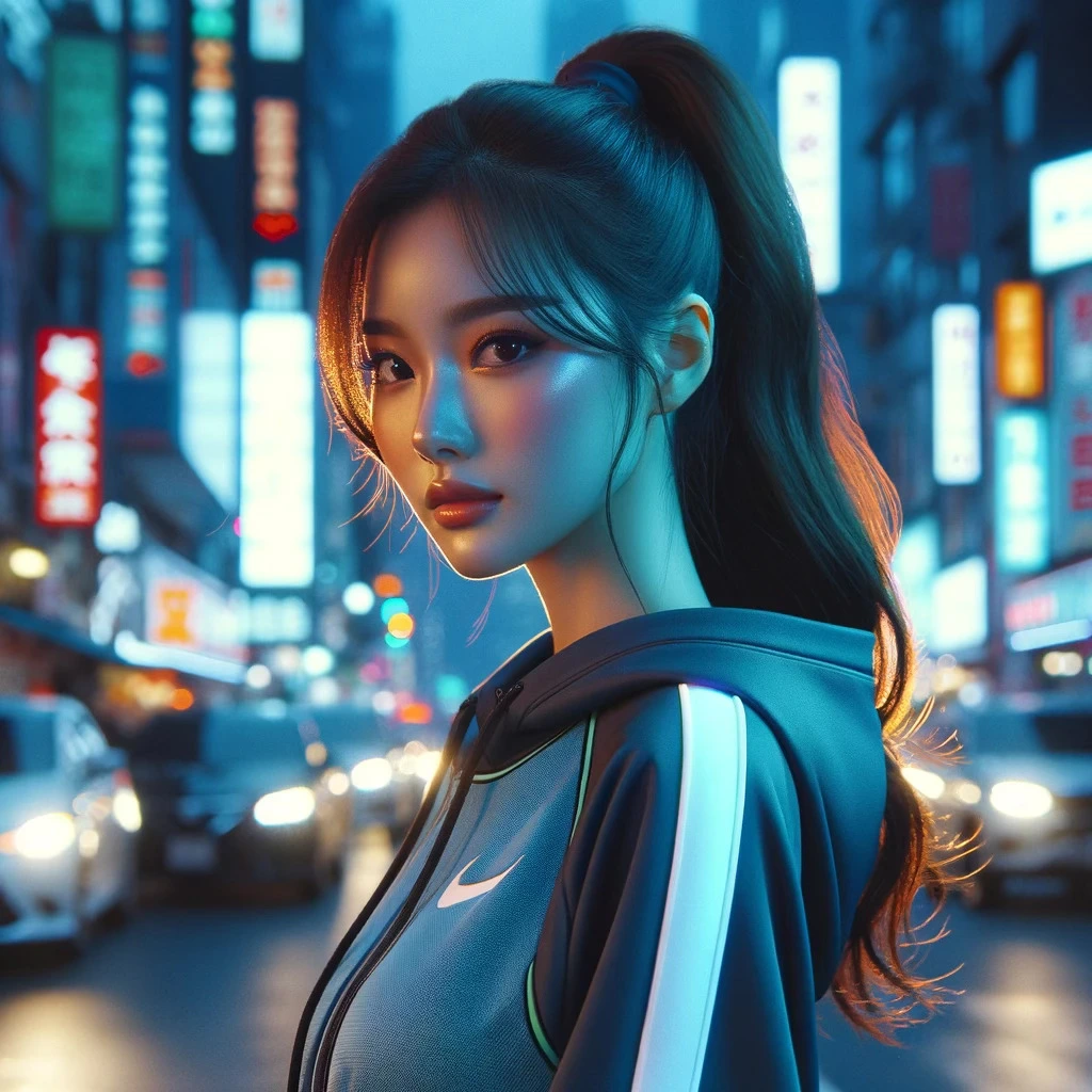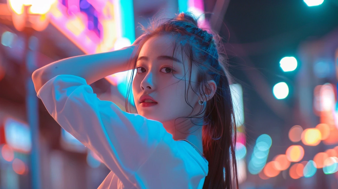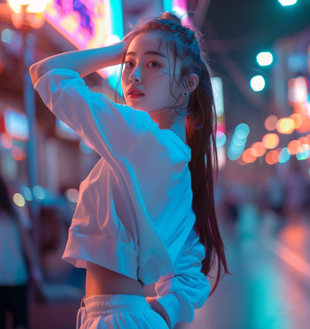 Cinematic 스타일로 네온 조명 아래의 한국의 20대 여성 모습을 요청했다. 머리스타일도 동일하게 긴 포니테일로 입력했으며 배경에 대한 상세한 묘사는 생략했다.